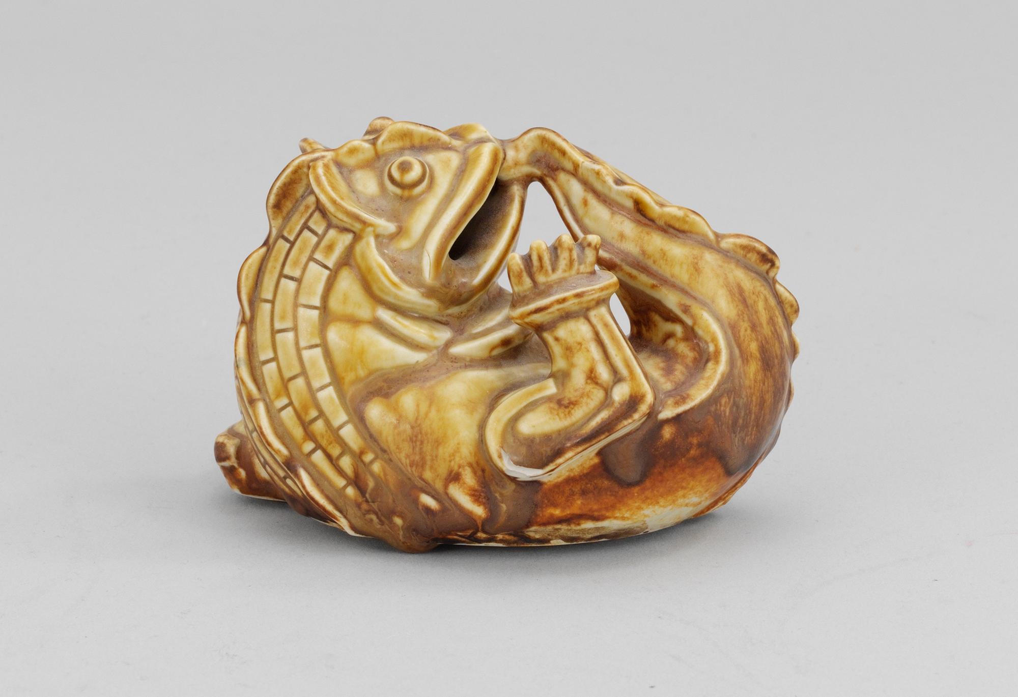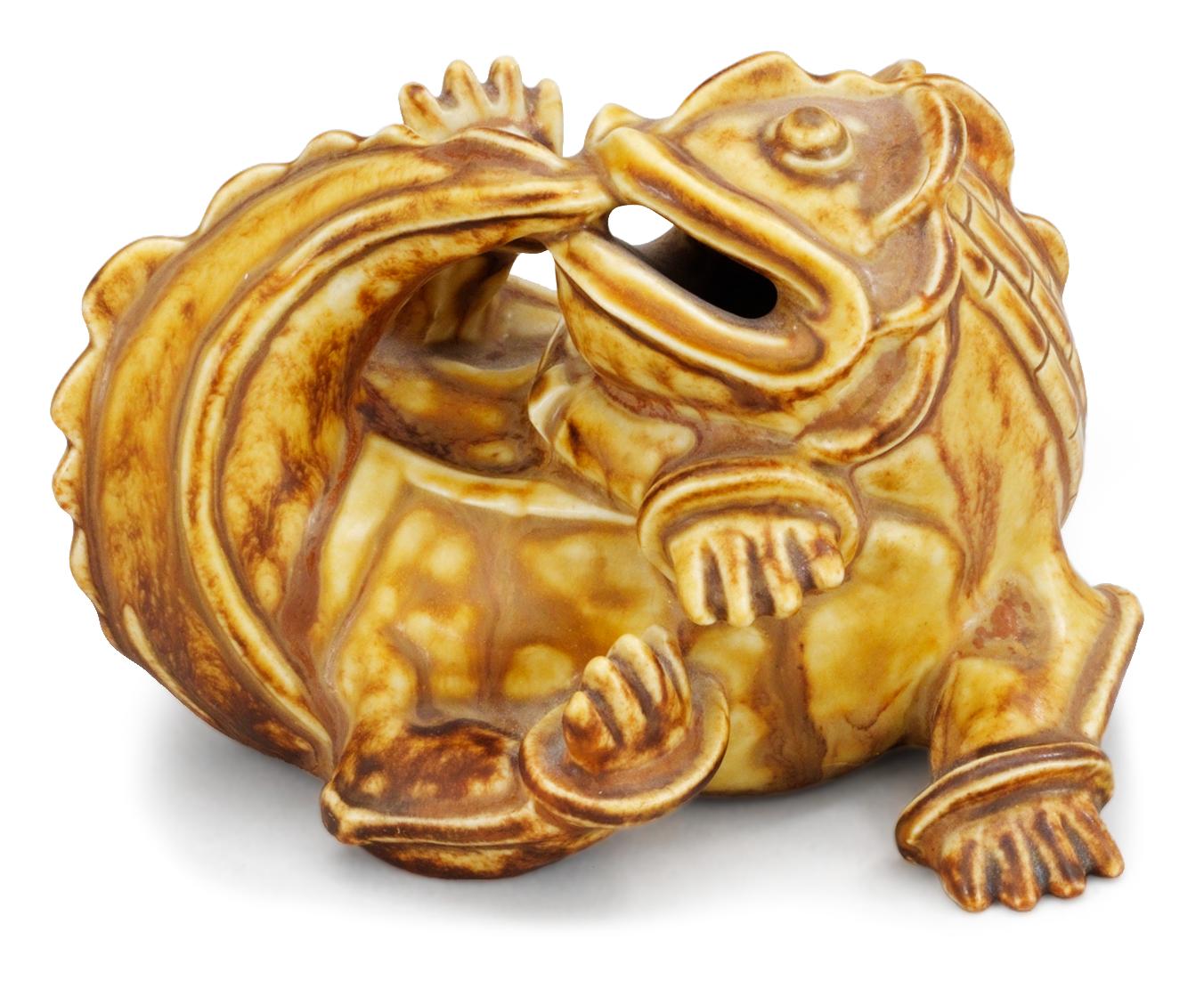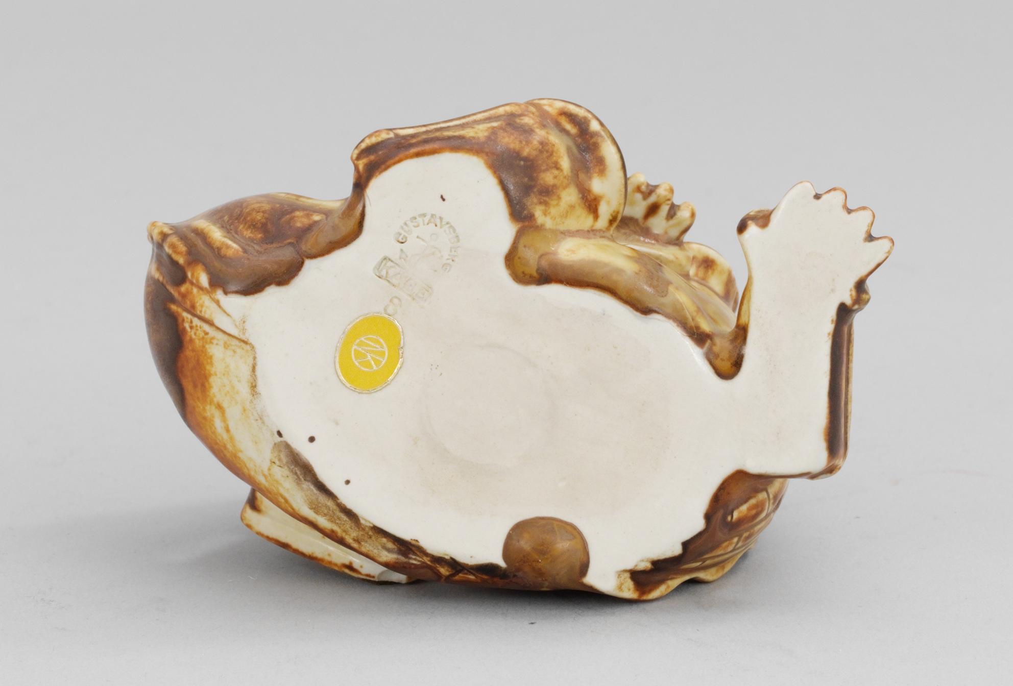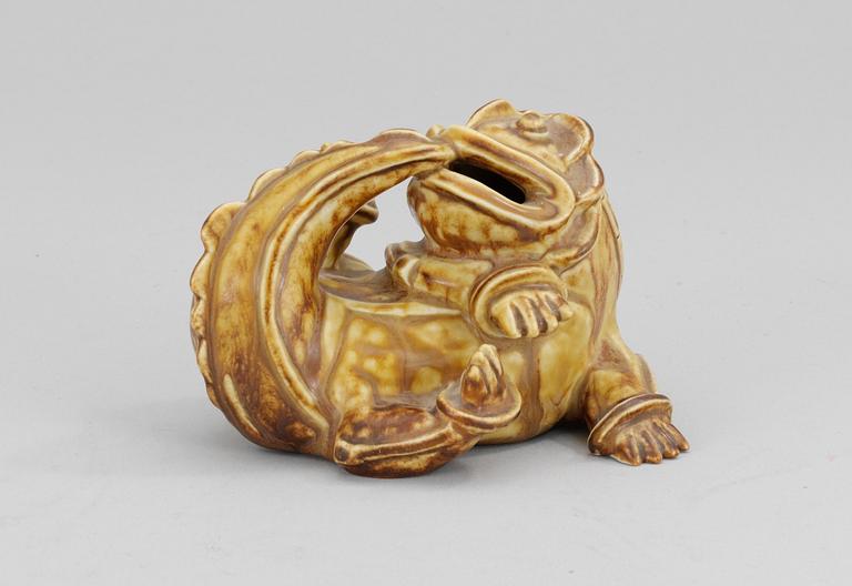 Stengods glaserat i gulbrunt, märkt med inpressad fabriksstämpel, KÅGE. Längd 12 cm.