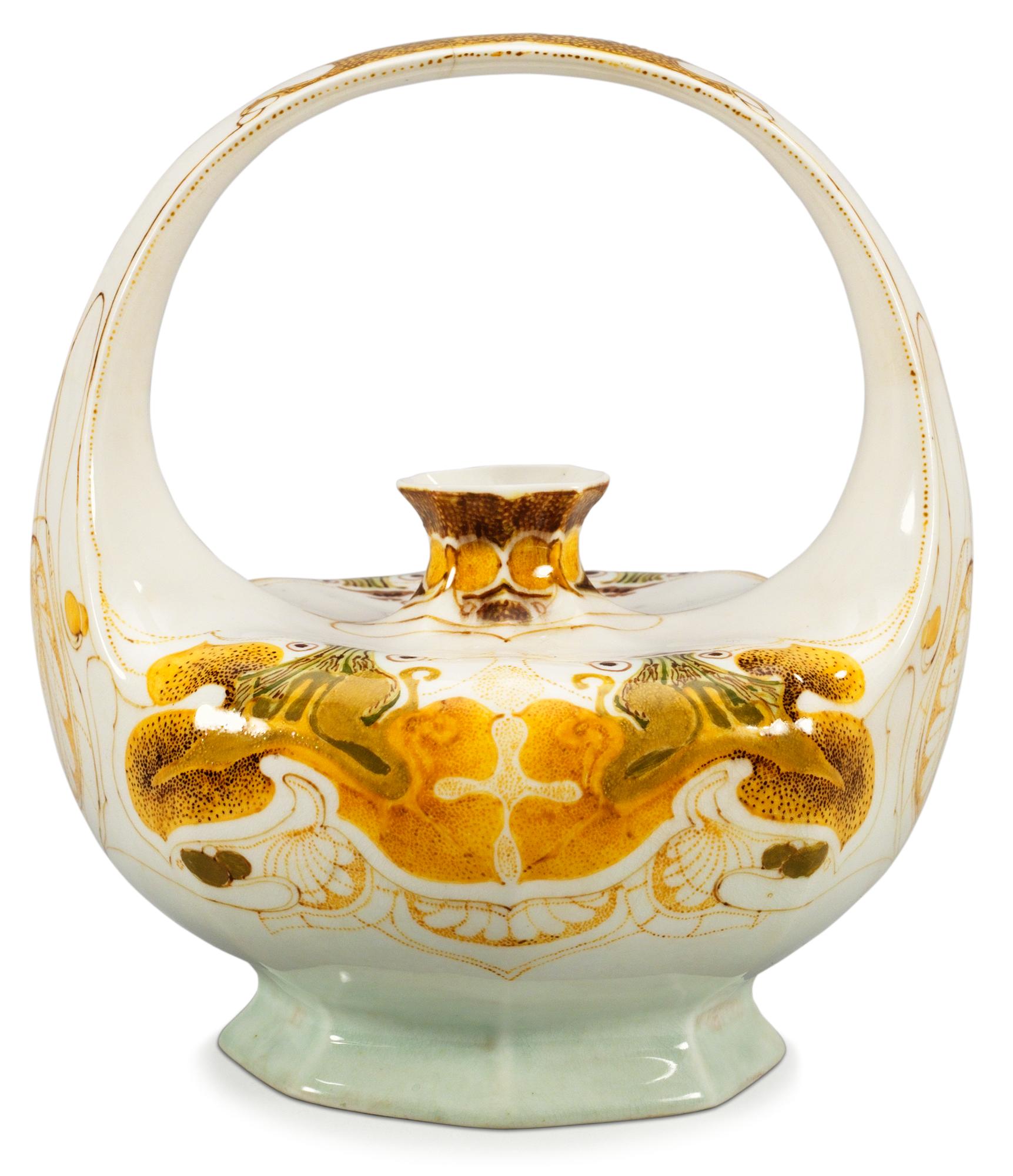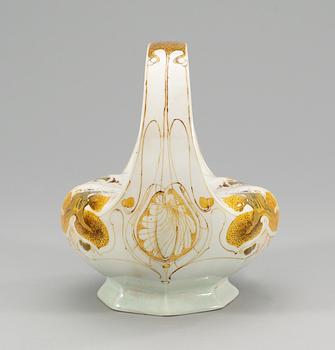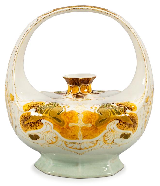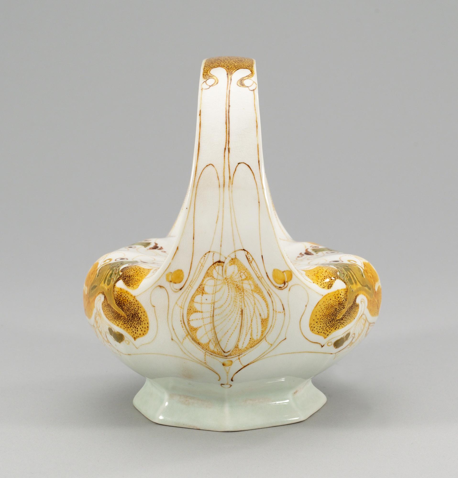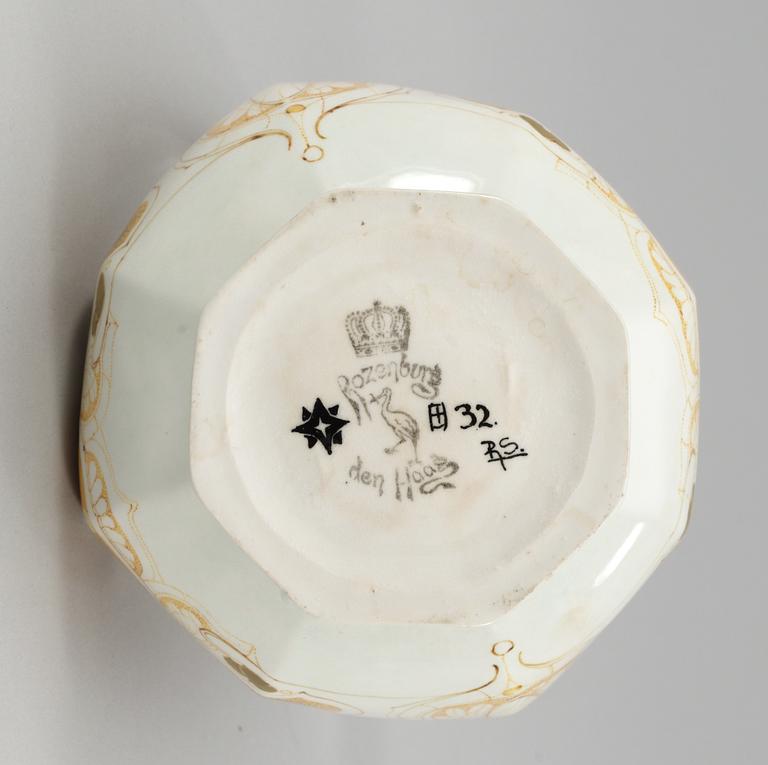 Äggskalsporslin, målad blomsterdekor av Iris i gult, brunt och grönt. Signerad Rozenburg den Haag RS 32. Höjd 16 cm.