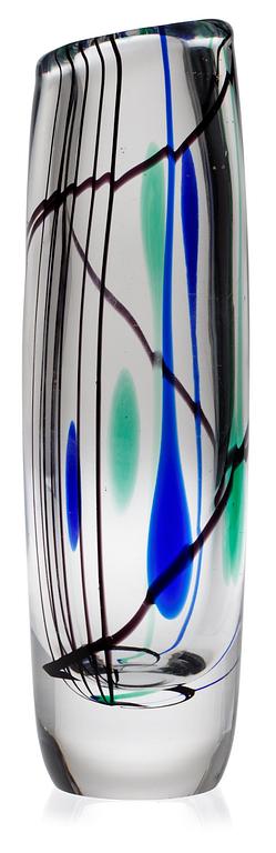 Invändig dekor i grönt, blått och mörkviolett. Signerad Kosta Lu 2036. Höjd 29 cm.