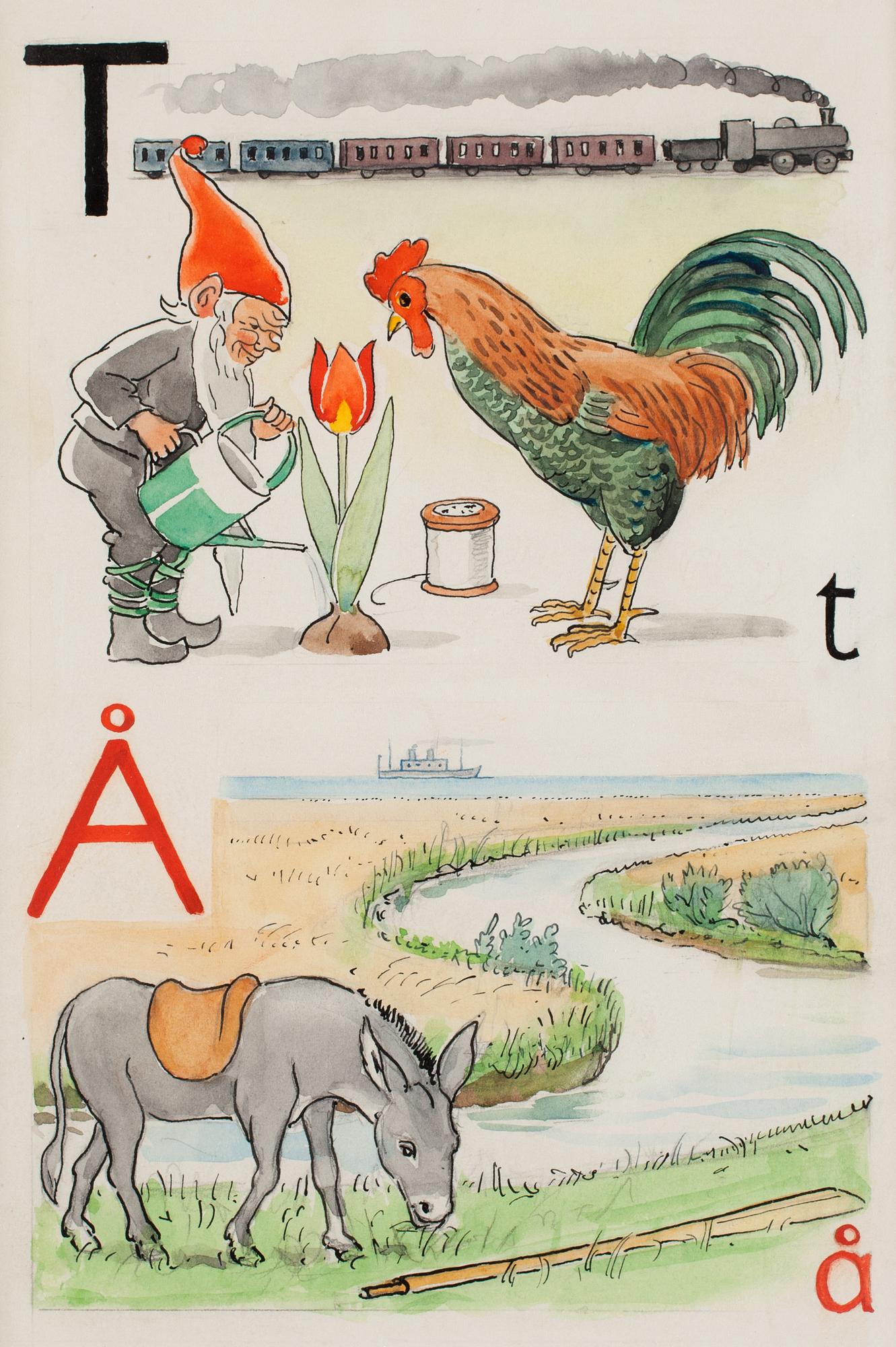 Watercolour and ink 22 x 15 cm. From "Vill du läsa I", page 14, picture 21, 22 cm.