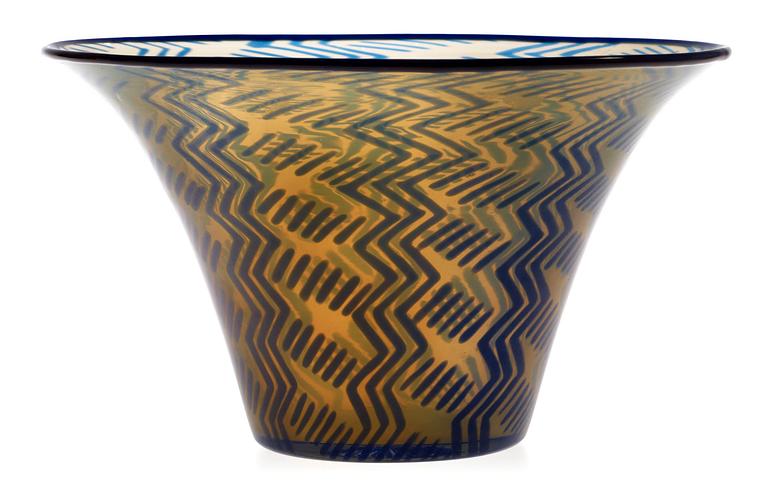 Stylized decoration in blue against green. Height 11,5 cm, diameter 20,5 cm.