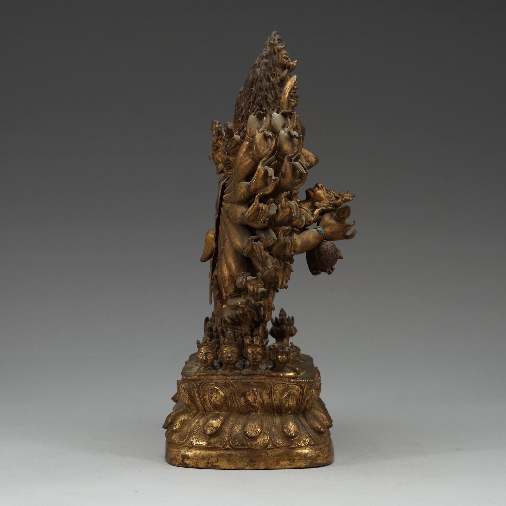 Powerfully cast with his arms radiating around him and striding in alidhasana on prostrated figures over a lotus base, holding a vajra and skullcup in his principal hands wrapped around his consort, his face with a ferocious expression. Height 34,5 cm.