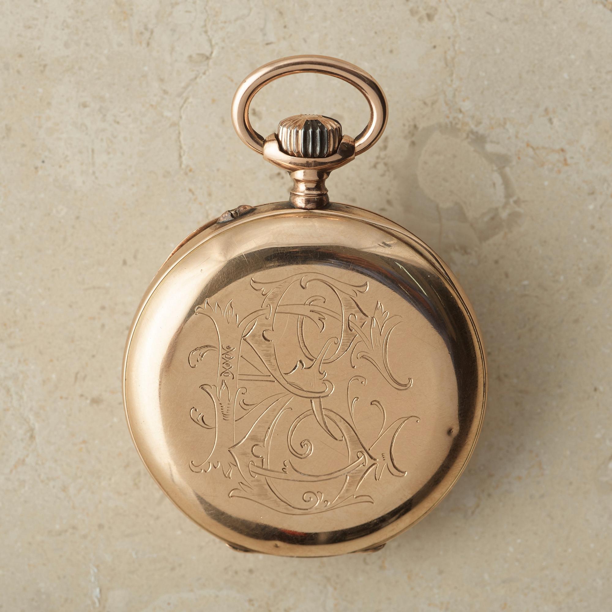 18K gold, lever escapement, inner cover in 18K gold, inscription, monogram, total weight 94 gram, ca 1898.