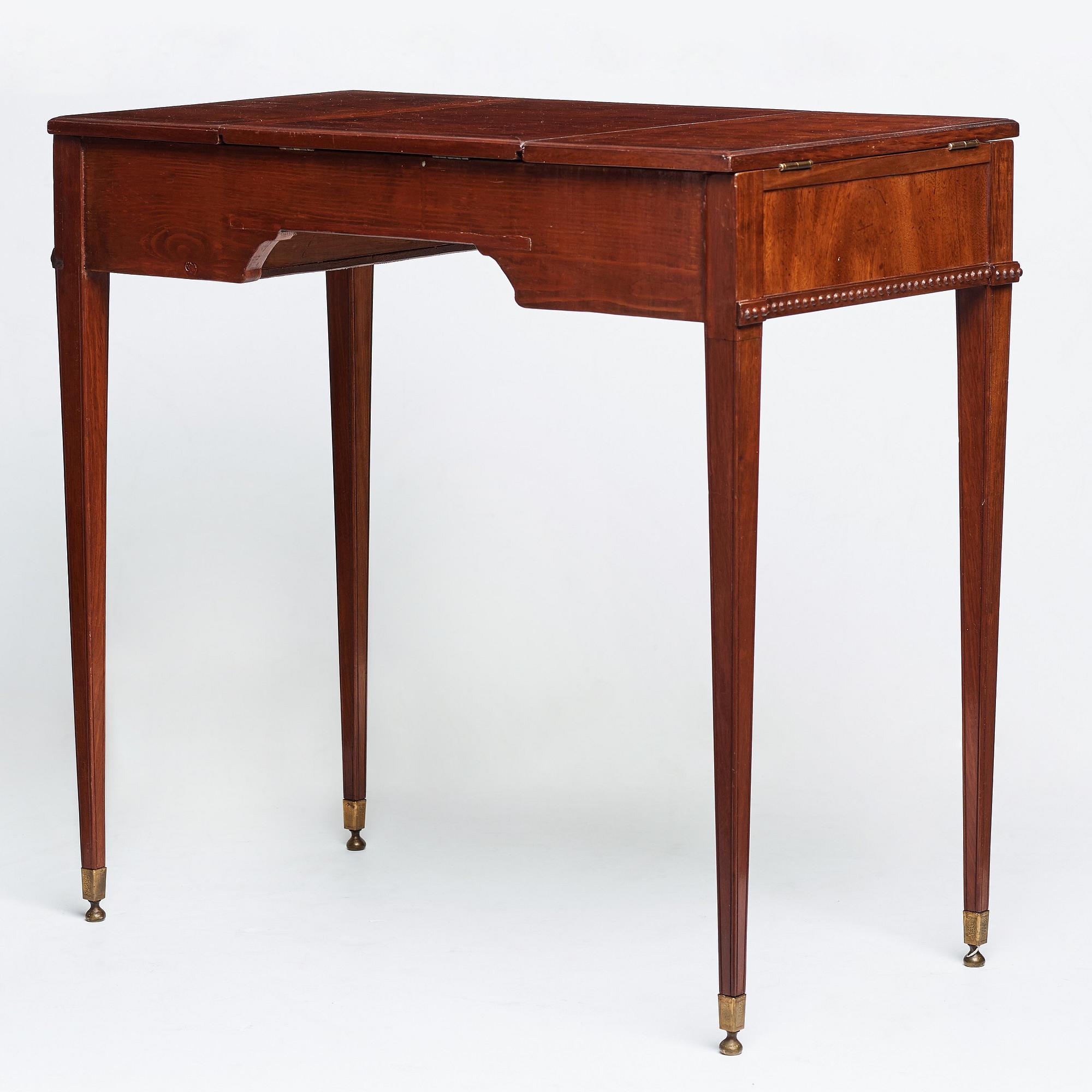 Mahogany and mahogany veneer. Three folding lids, the one in the middle with a mirror. Below unidentified red lacquer seal with coat of arms.Length 78.5, width 42.5, height 75.5 cm. Key included.