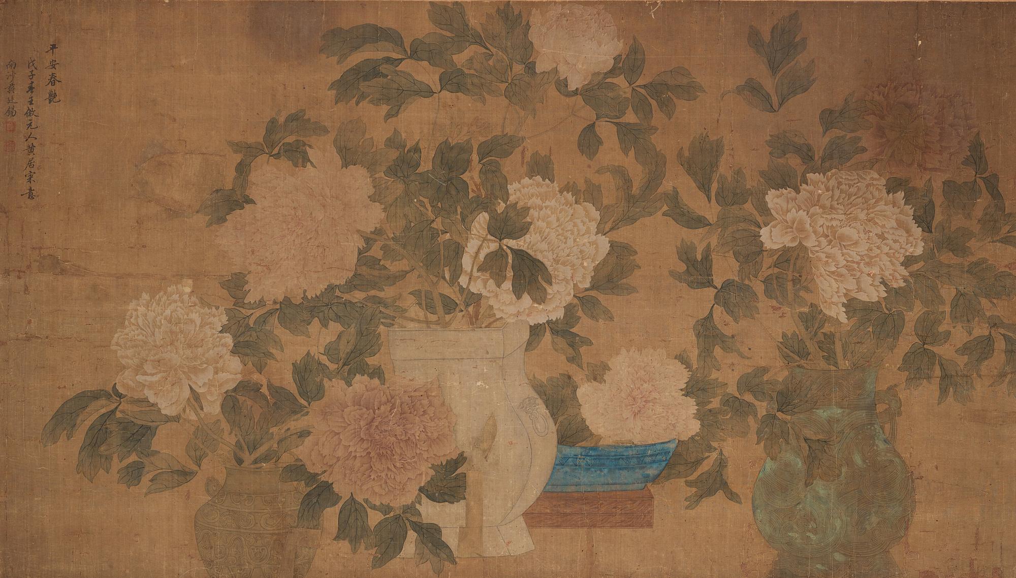 Depicting flowers and antiquities, calligraphy and two red seal. Image size 60,5 x 107 cm.