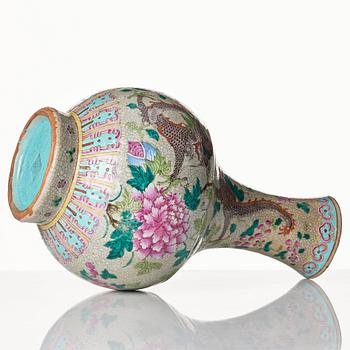 Baluster shape on a tall foot, decorated in famille rose colours with a four clawed dragon amidst flowers against a ge-glazed ground. Height 36 cm.