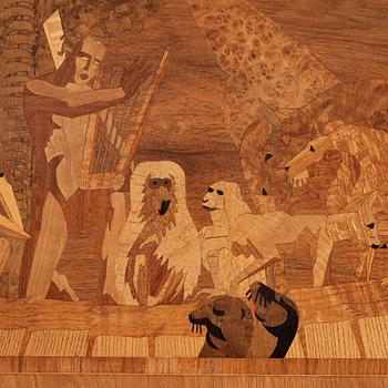 Veneered with elm, slanted flap with marquetry decor with inlays in different types of wood of a figure scene representing Orpheus playing the lyre among wild animals, legs with blackened pillars, interior with drawers and compartments, knobs in darker wood, built-in lighting, marquetry signed E Dahlskog, marked with metal plate below, dimensions 95 x 46 cm, height 112 cm, writing flap unfolded, height 74.5 cm. Key included.