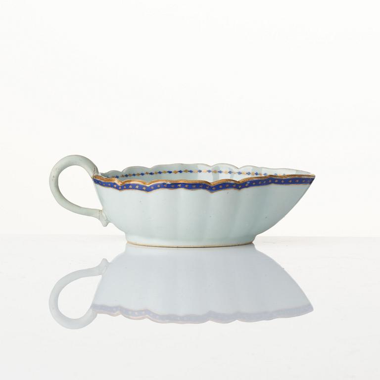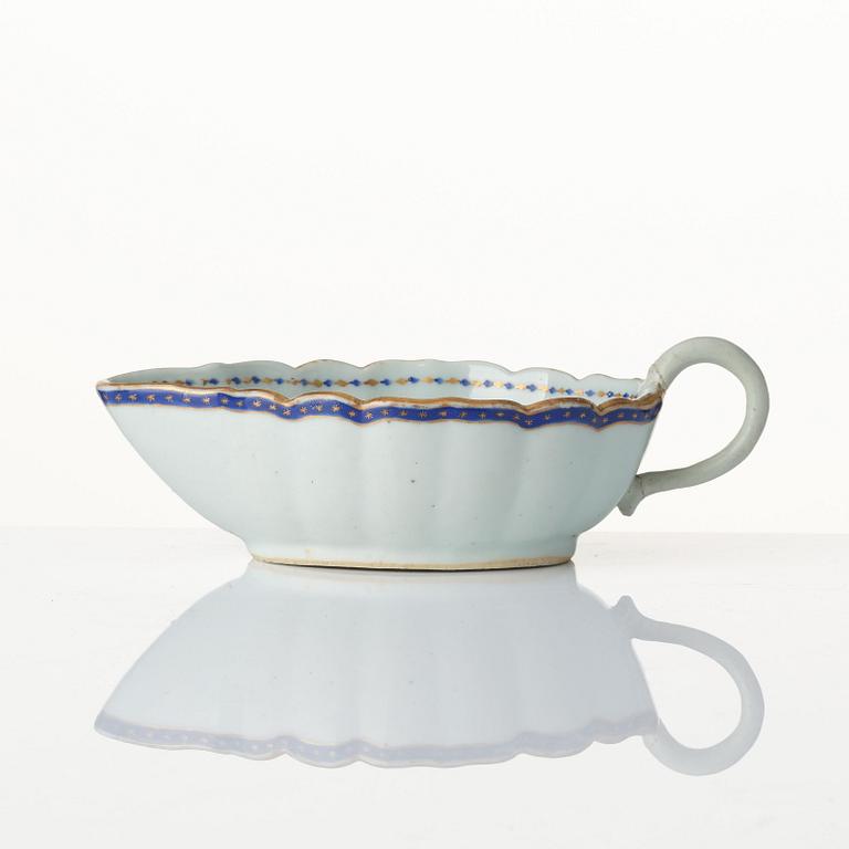 Decorated in blue enamels and gold with carnations and enamel bands. Comprising: six custard cups with covers, height 9.5 cm, a sauce boat, length 19 cm, a chestnut basket with stand, height 14.5, length 28 cm,