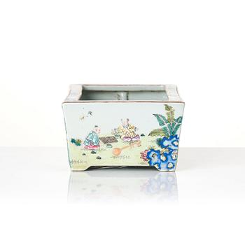 Rectangular shape, decorated with figure scenes with boys playing in a garden that runs around the piece. Rim with blue meander decoration. Qianlong mark to base in red. Measure 25x16 cm. Height 9.5 cm.