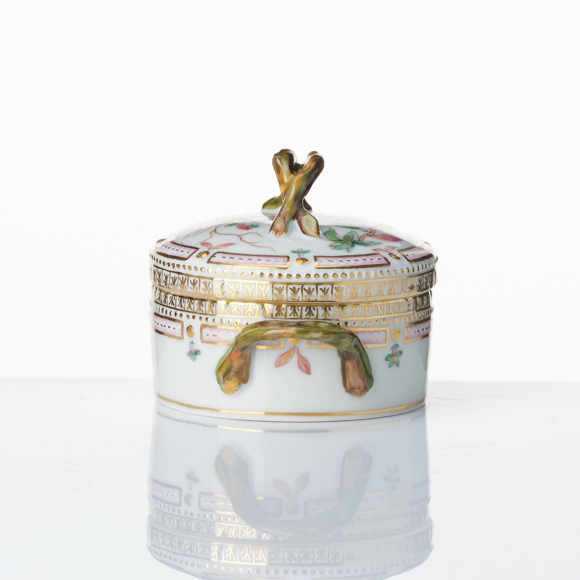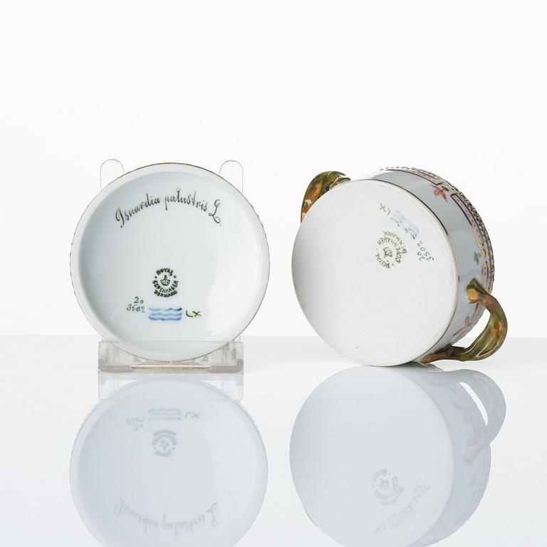 20th century. Marked with model no 3508. Length 23 cm. Sugar bowl with cover, model no 3502, length 11 cm. Three dishes, model no 3513, diameter 14 cm. Painted and gilded decoration after a Danish litterary work over the Danish flora.