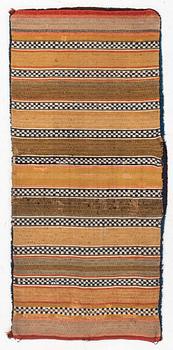 A dark brown flat woven ground with two polychrome flowers and smaller tulips, as well as a man and women. Border with polychrome checkerboard pattern.