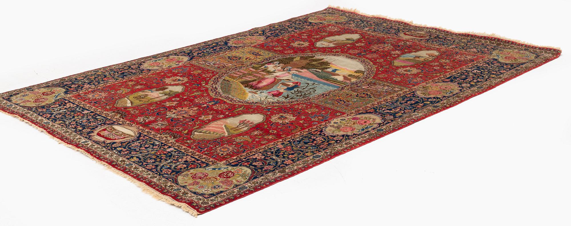 Around 1930. A red ground with large polychrome landscape medallions, the central one depicting 'The Finding of Moses'. A dark blue main border adorned with a floral and arabesque vine as well as large cartouches. Signed Mehdizadeh.