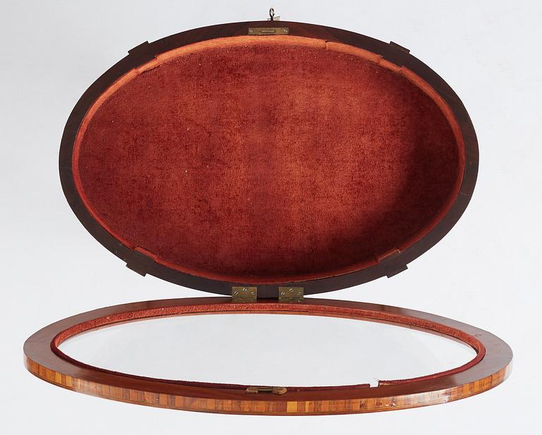 Oval top enclosing a velvet-lined interior, on four straight tapering legs with a cross stretcher. Length 81, width 55.5, height 75 cm.