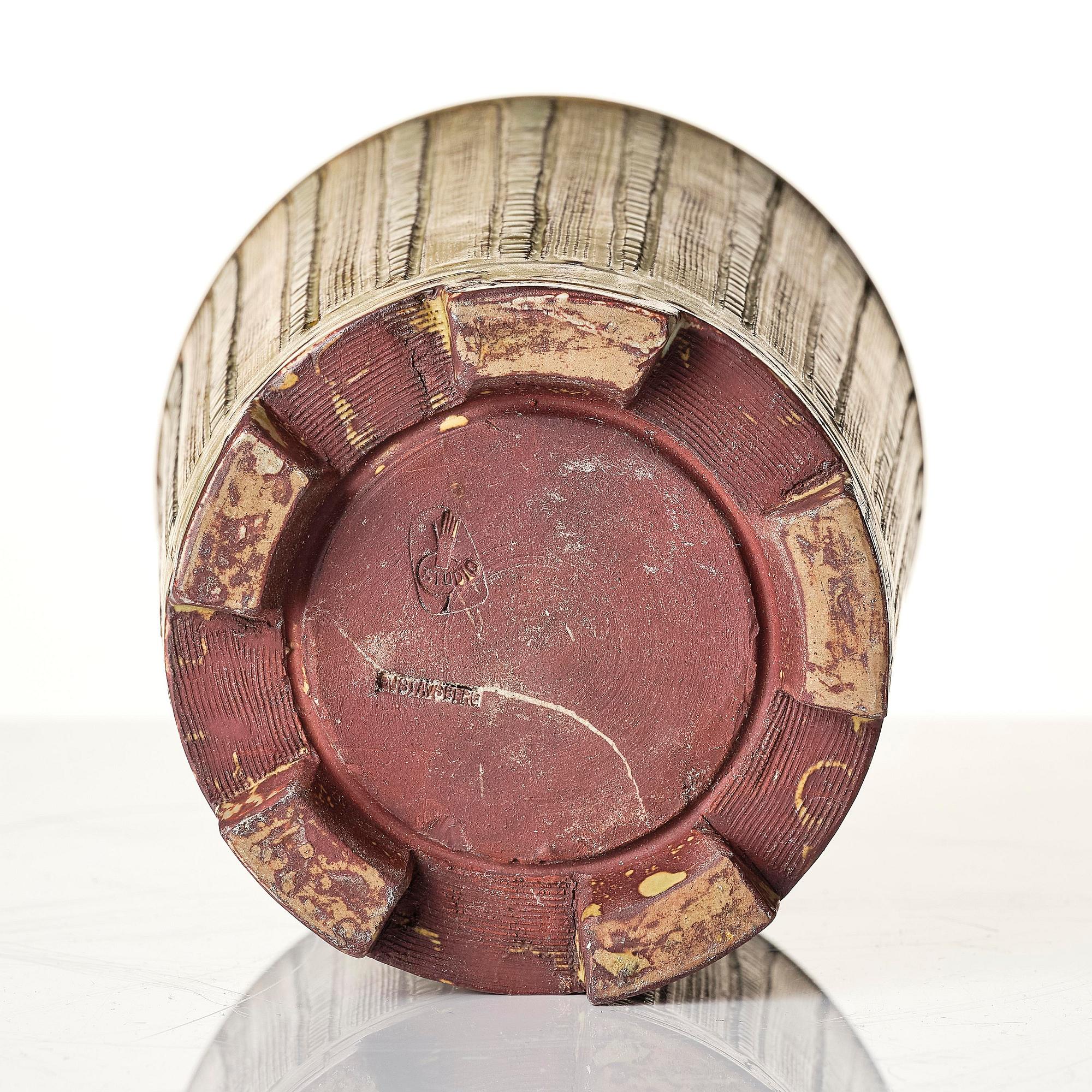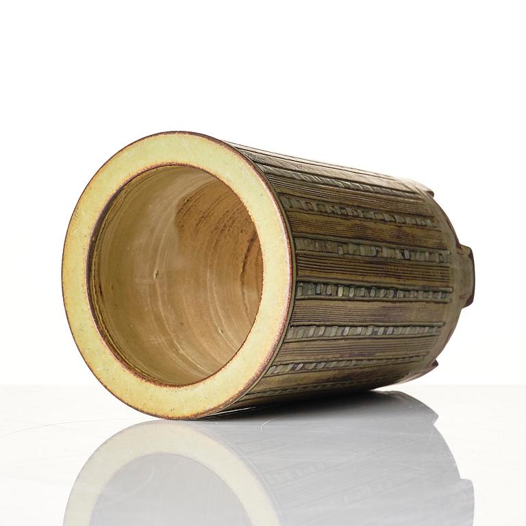 Conical shape on five feet, engraved geometric decoration, glaze in yellow and green-yellow, marked with Gustavsberg studio stamp and engraved R. Height 16.5 cm, diameter 12 cm.
