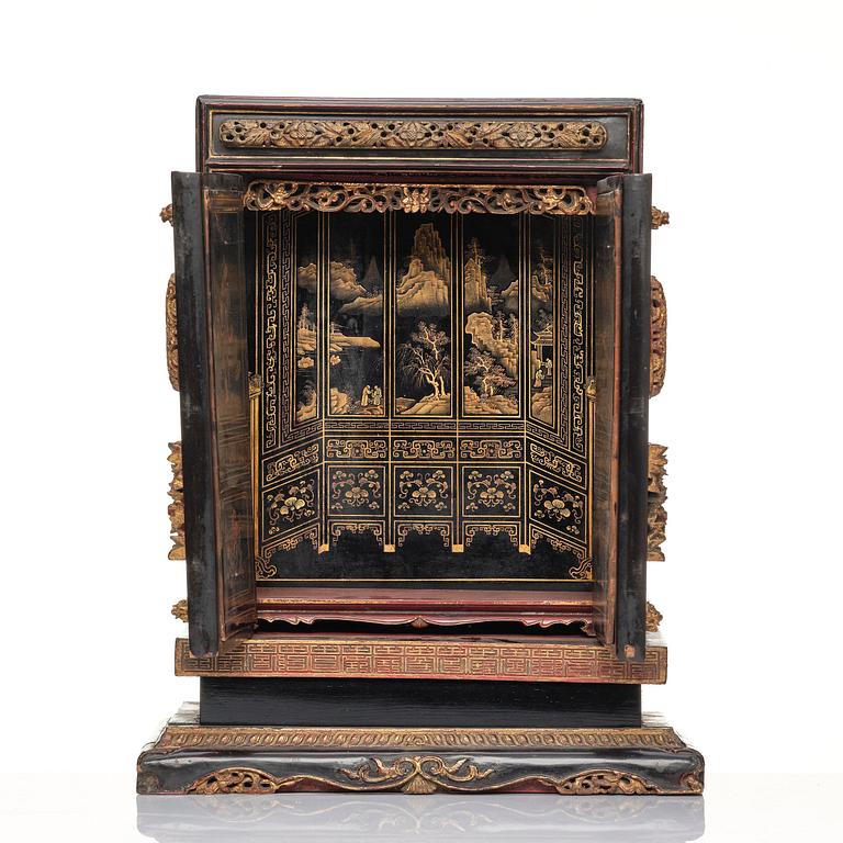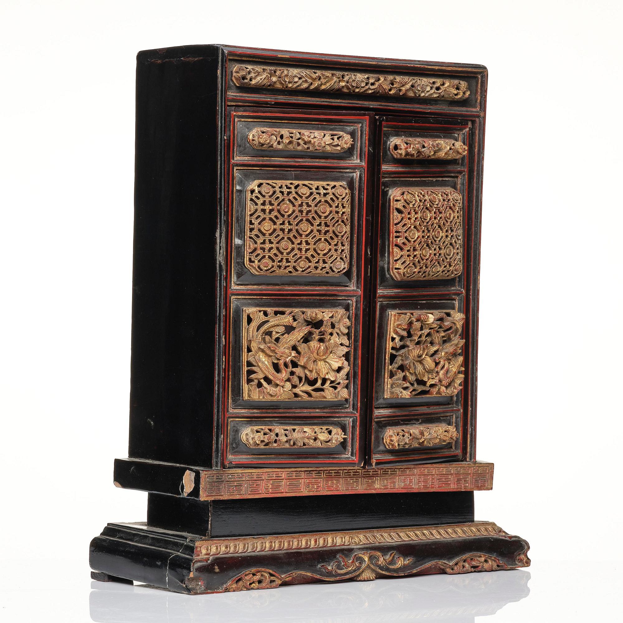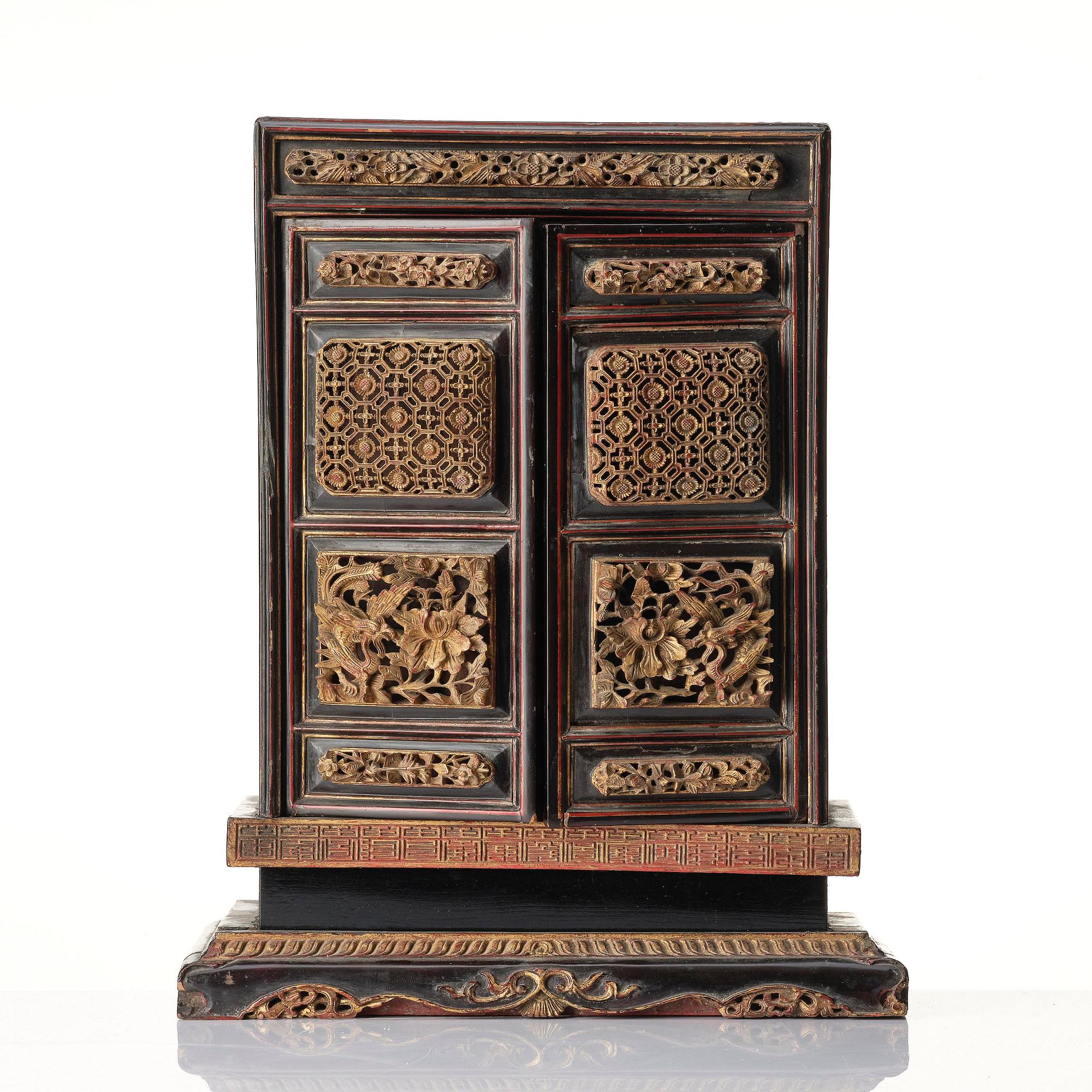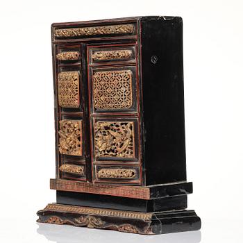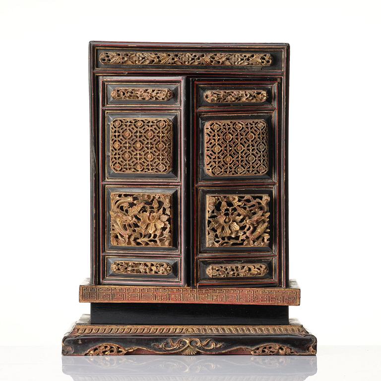 Supported on a stepped foundation, the rectangular cabinet with two doors mounted with reticulated geometric and the floral domed panels painted in gilt, the interior finely gilt-painted with a four-fold screen. The interior of the doors painted. Measure 37x45x16 cm.