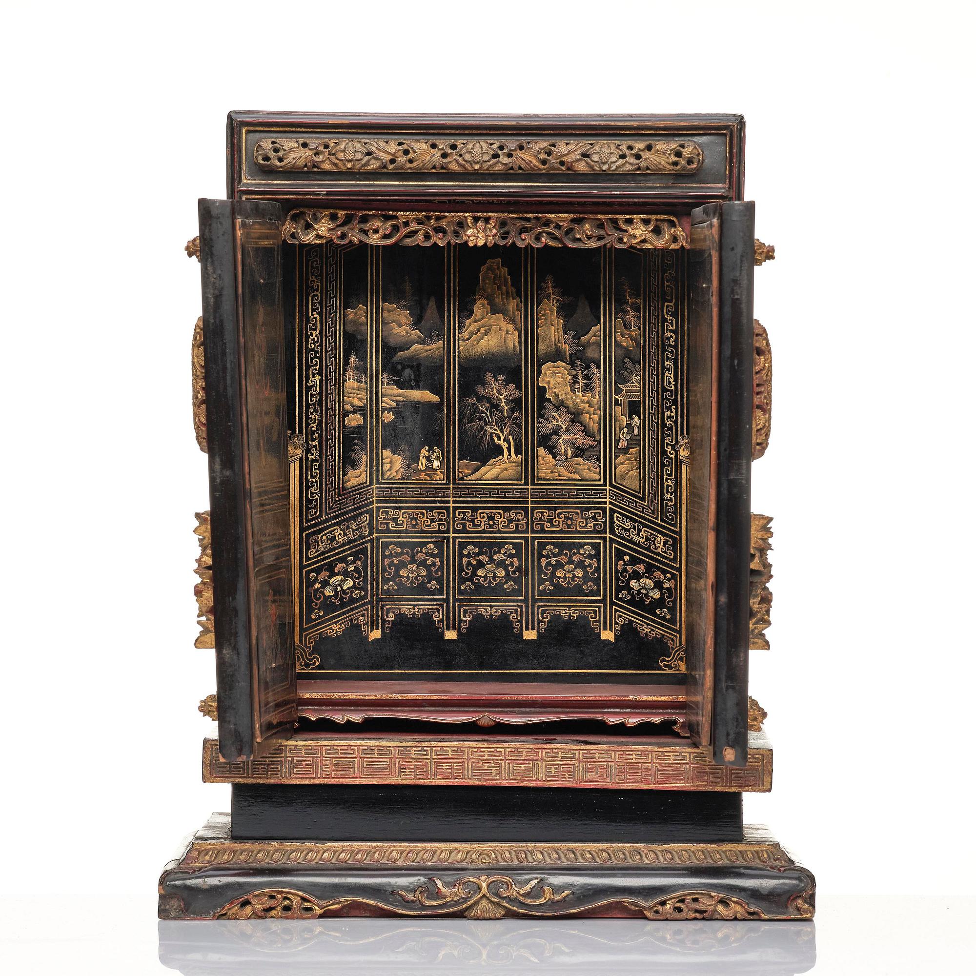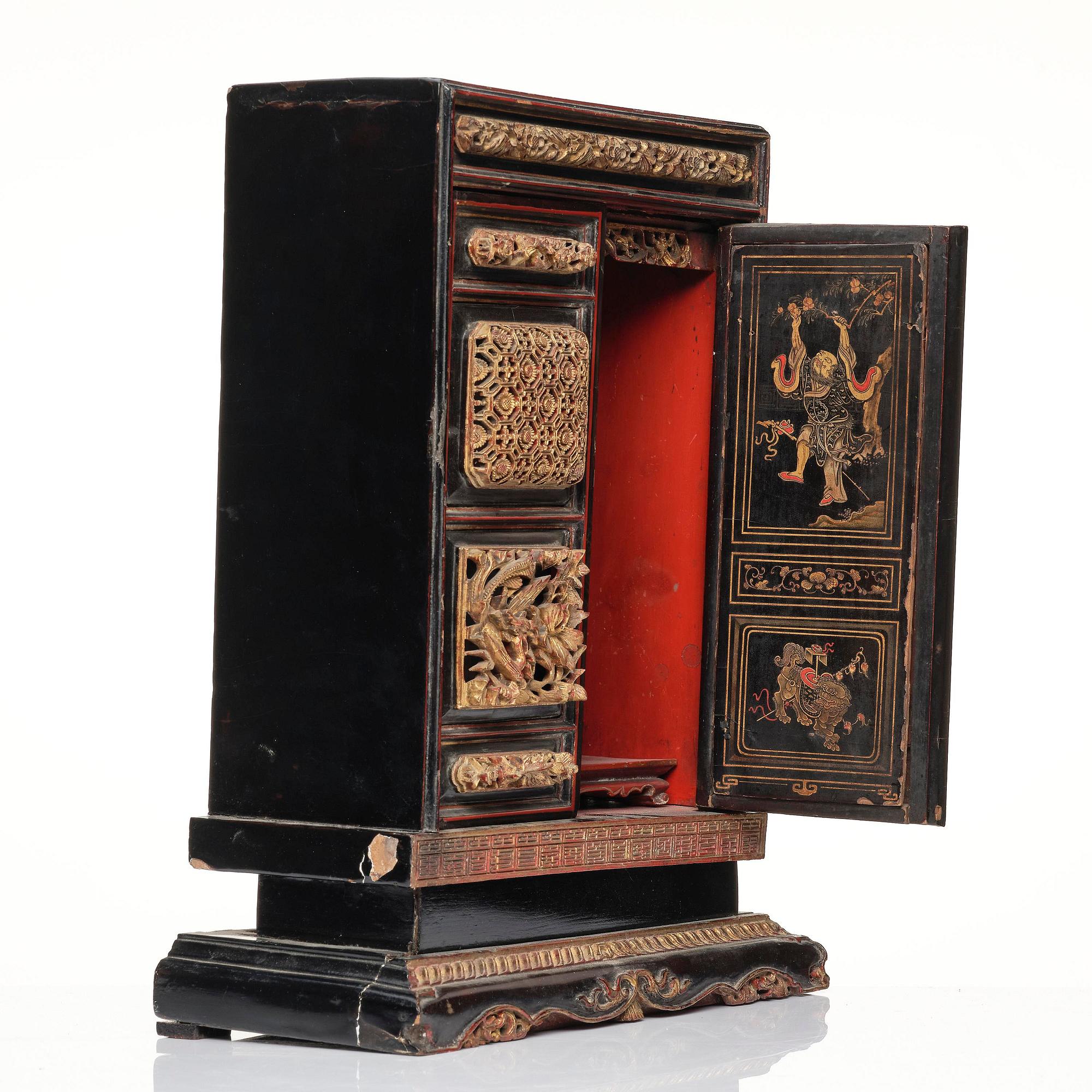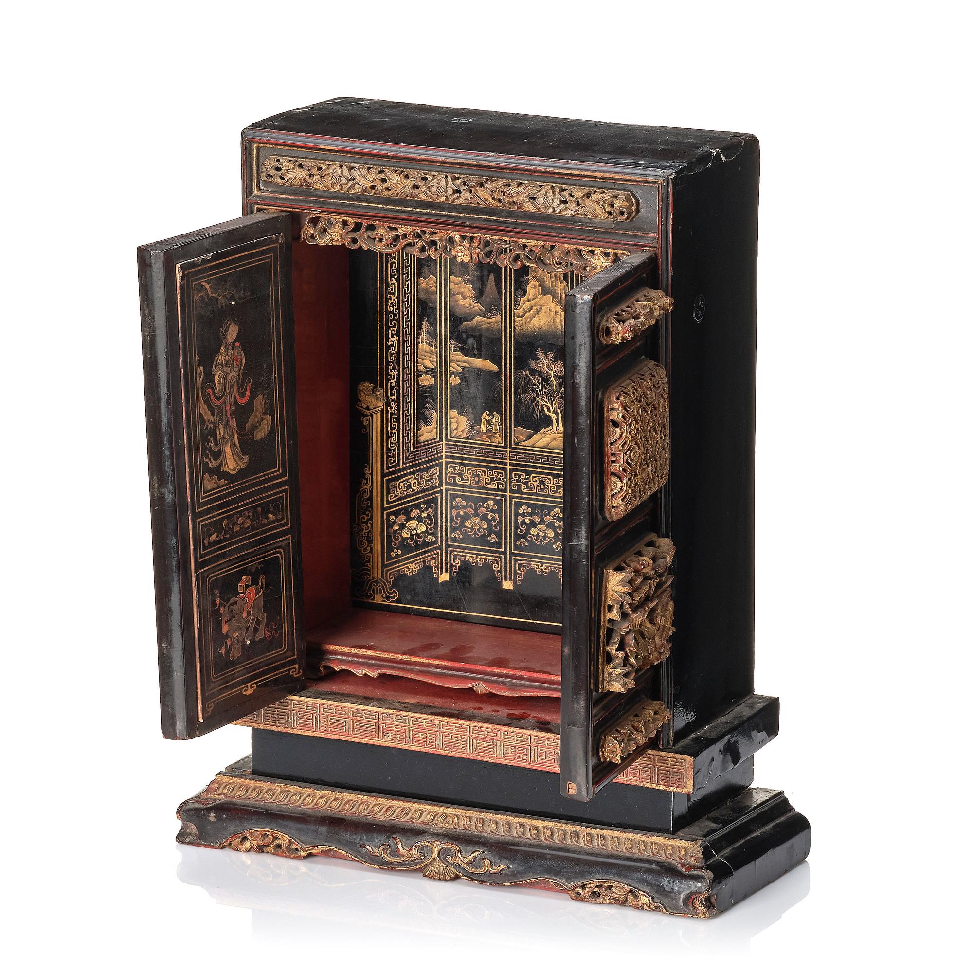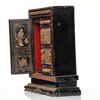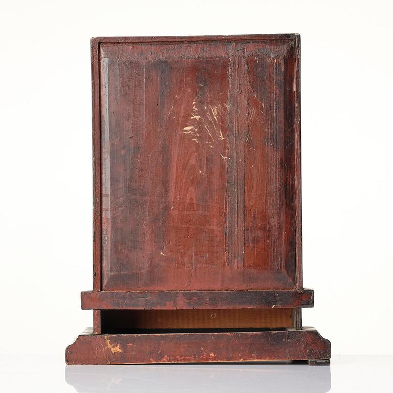 Supported on a stepped foundation, the rectangular cabinet with two doors mounted with reticulated geometric and the floral domed panels painted in gilt, the interior finely gilt-painted with a four-fold screen. The interior of the doors painted. Measure 37x45x16 cm.