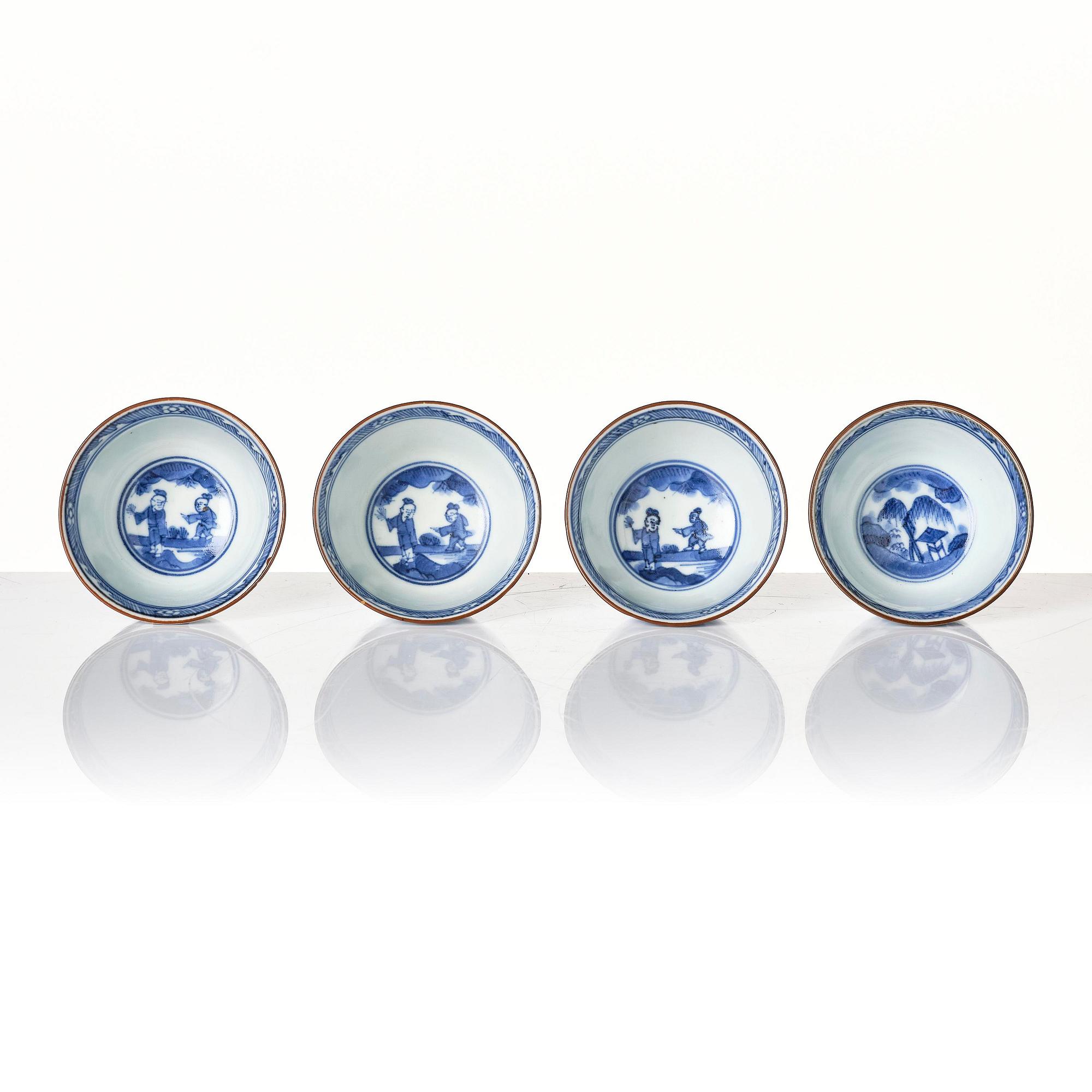 Decorated in underglaze blue with landscapes, flowers and figures. Diameter cup 7.2 cm. Diameter dish 11.8 cm.
