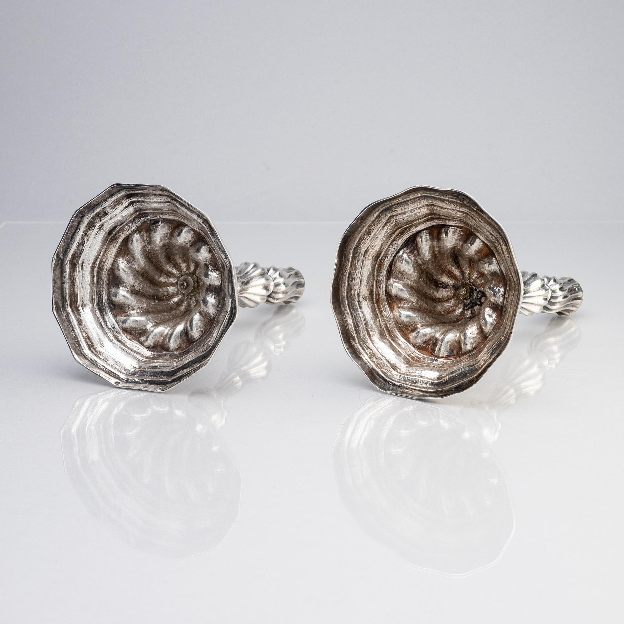Baluster-shaped shaft, decorated with curved brackets. The detachable cuffs also bear hallmarks. Height approximately 24.5 cm. Total weight 1036 g.