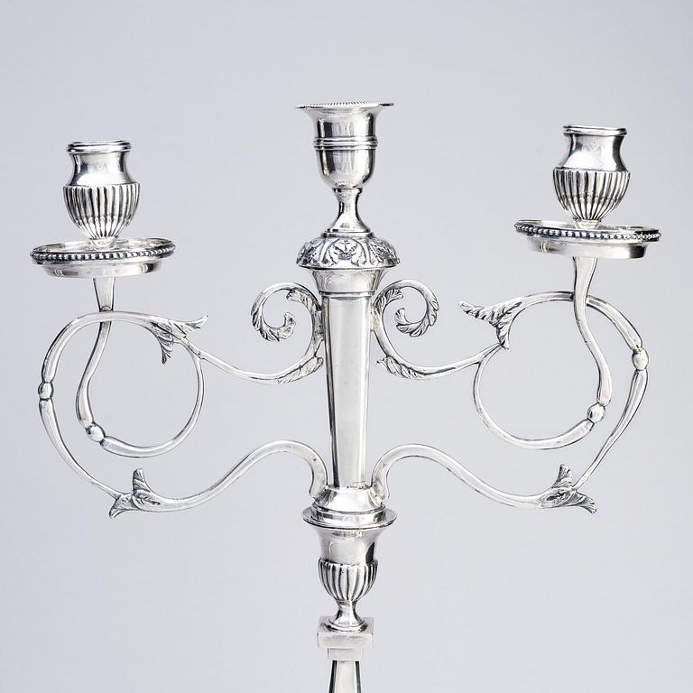 Obelisk-shaped shaft, on a square base with applied antiqued medallions, chamfered corners, and ball feet. Removable leaf-decorated arms with urn-shaped candle holders. One weight indication 41 1/8 (lot). Total height 29.5 cm and 50 cm. Total weight 2680 g.