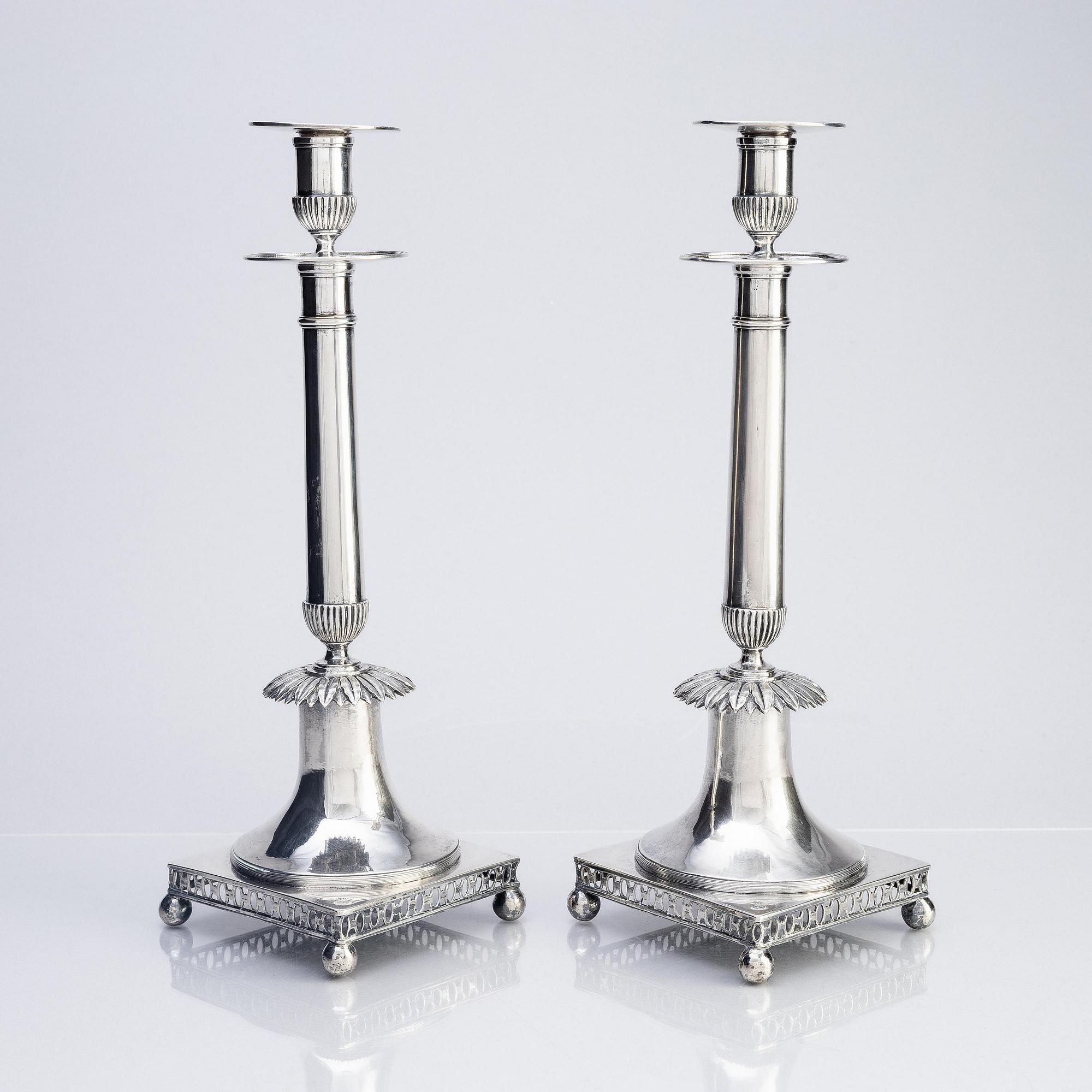 Column shafts with leaf decoration at the bottom near the bell-shaped round base with a square base standing on four ball feet. Urn-shaped, candle holder with detachable cuffs. The cuffs also bear maker's marks. Owner's stamp with monogram OR under a baronial crown. Height 35 cm. Total weight 1261 g.