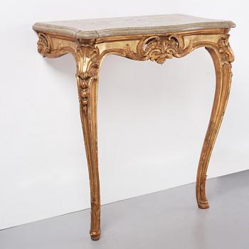 Gilt and bronzed. Partially openwork decoration of acanthus and shell formations. Top of grey limestone. Length 73, width 38, height 80 cm.
