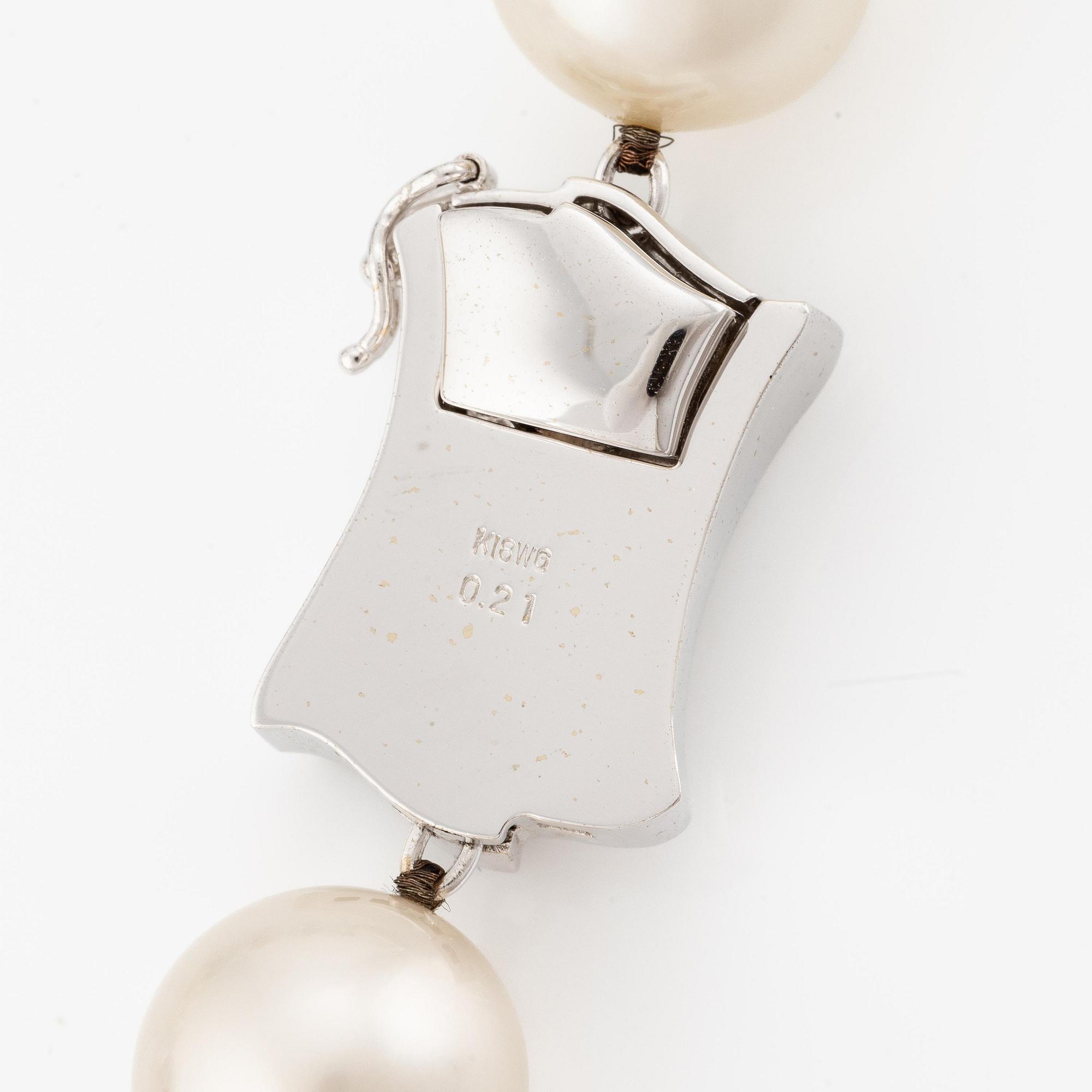 Clasp in 18K gold with round brilliant-cut diamonds, total weight 0.21 ct according to engraving, and mother-of-pearl, pearl diameter ca 12.8 - 15.7 mm, length with clasp ca 49.5 cm.