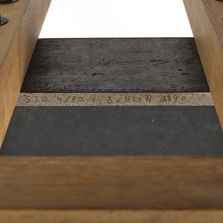 Iron and oak, signed and numbered STO 4/70 j BoHLiN 1990. Depth 52.5 cm, width 31.5 cm, height 94.5 cm, seat height 48 cm.
