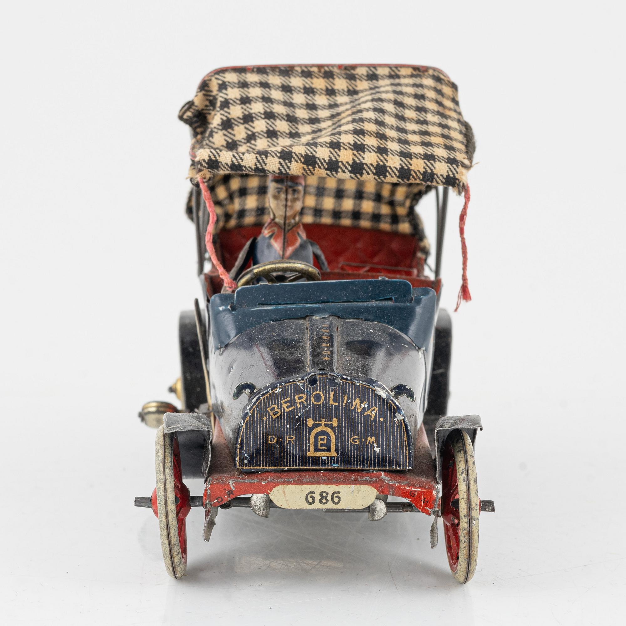 Lithographed tin plate. Foldable textile roof. Clockwork driven. Length approximately 18 cm.