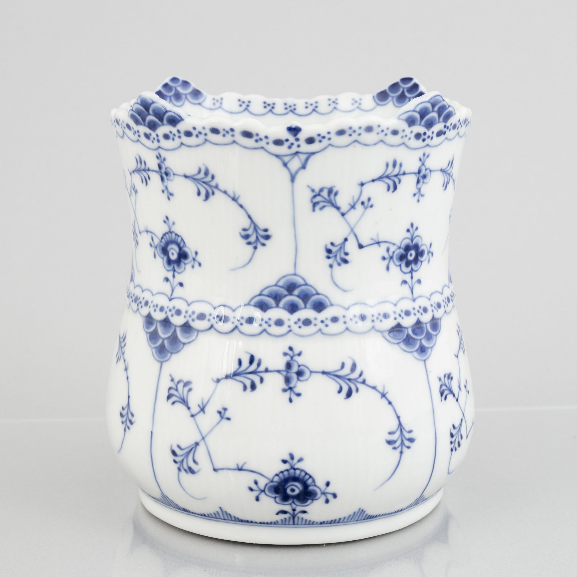 Decorated with underglaze blue. Height 17 cm. Marked "1/627" with painter's signature "60." and green stamp "Royal Copenhagen". Originally called "sellerikrukke" (celery vase) modelled by J. Jacobsen in September 1893.