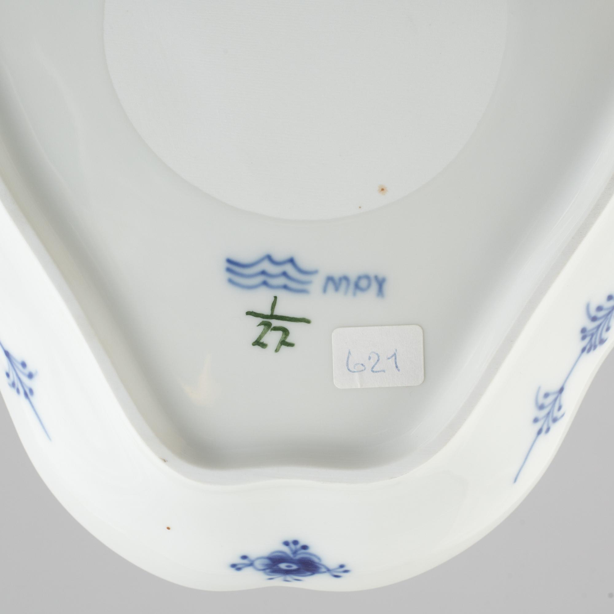 Triangular. Fluteed relief and decoration in underglaze blue. Marked "1/27" blue painter's signature "mpx" and green stamp "Royal Copenhagen Denmark". 21 x 22.5 cm. Originally referred to as salatfad/kagefad, trekantet" designed before 1884.