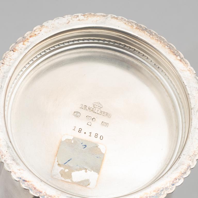 Interior gilding. Smooth with wave band decoration, frieze with transverse stripes and with a fluted foot. Diameter 12.5, height 18 cm. Weight 392 grams.