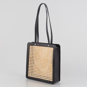 Black calfskin leather with woven rattan on the sides. Deeply embossed logo on the inside of the bag. Length 29, depth 10, height 31 cm. Dustbag and original box included.