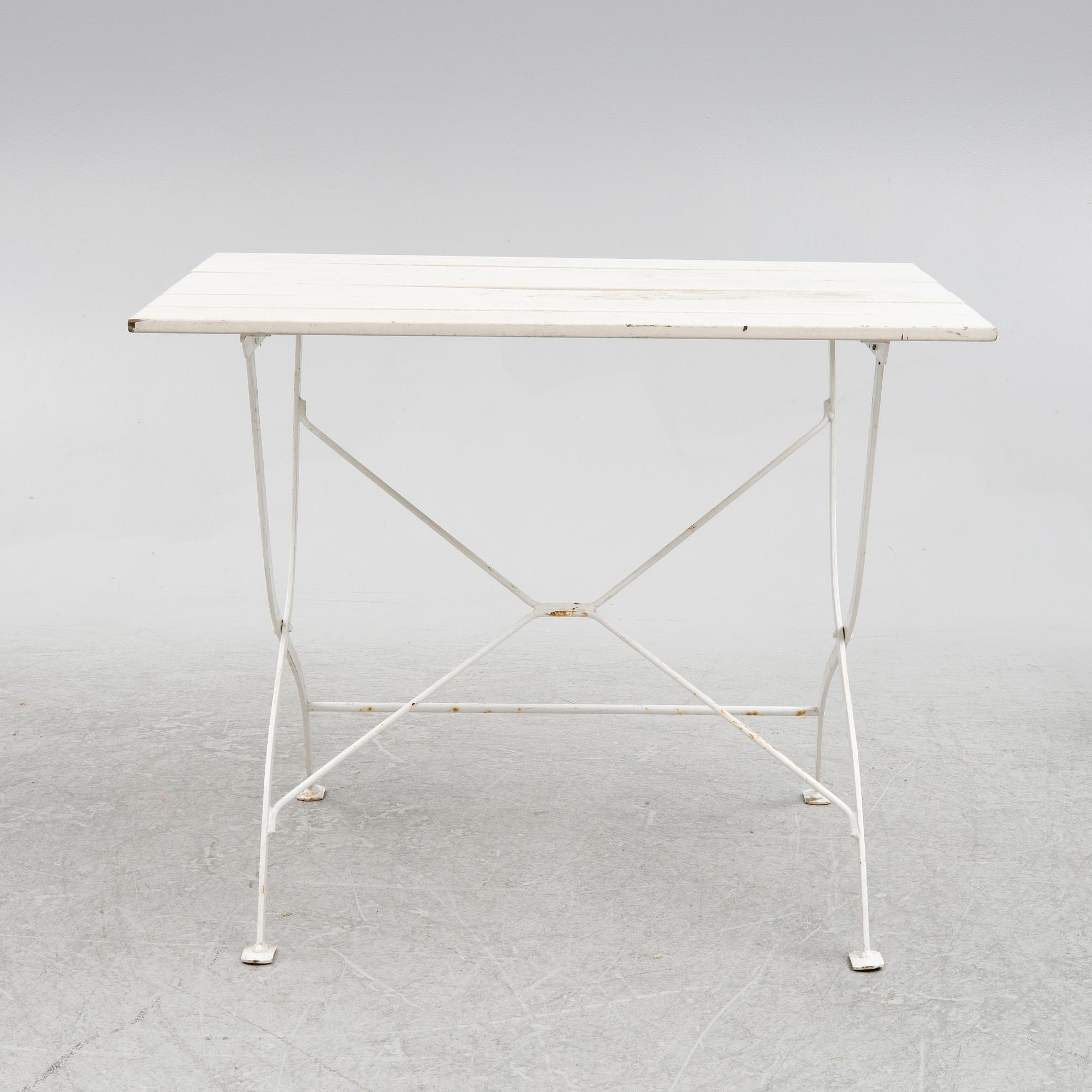 The table is label marked Grythyttan Stålmöbler, chairs with label with worn/unreadable text. White-painted metal and wood. Table 90 x 60, height 72 cm. Four chairs seat height 46, height 86 cm. The chairs and table are foldable.