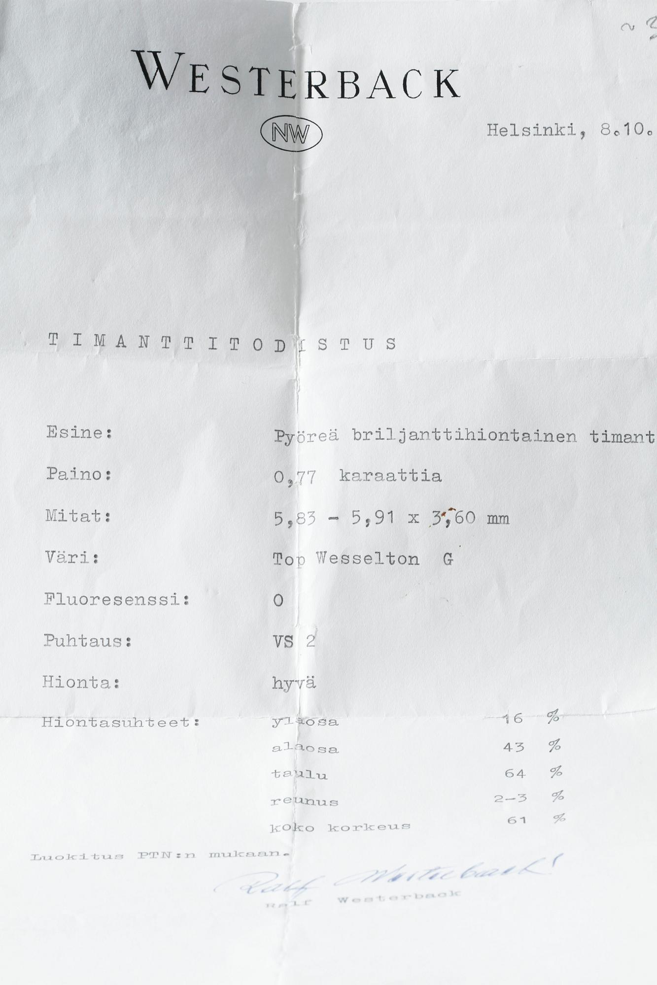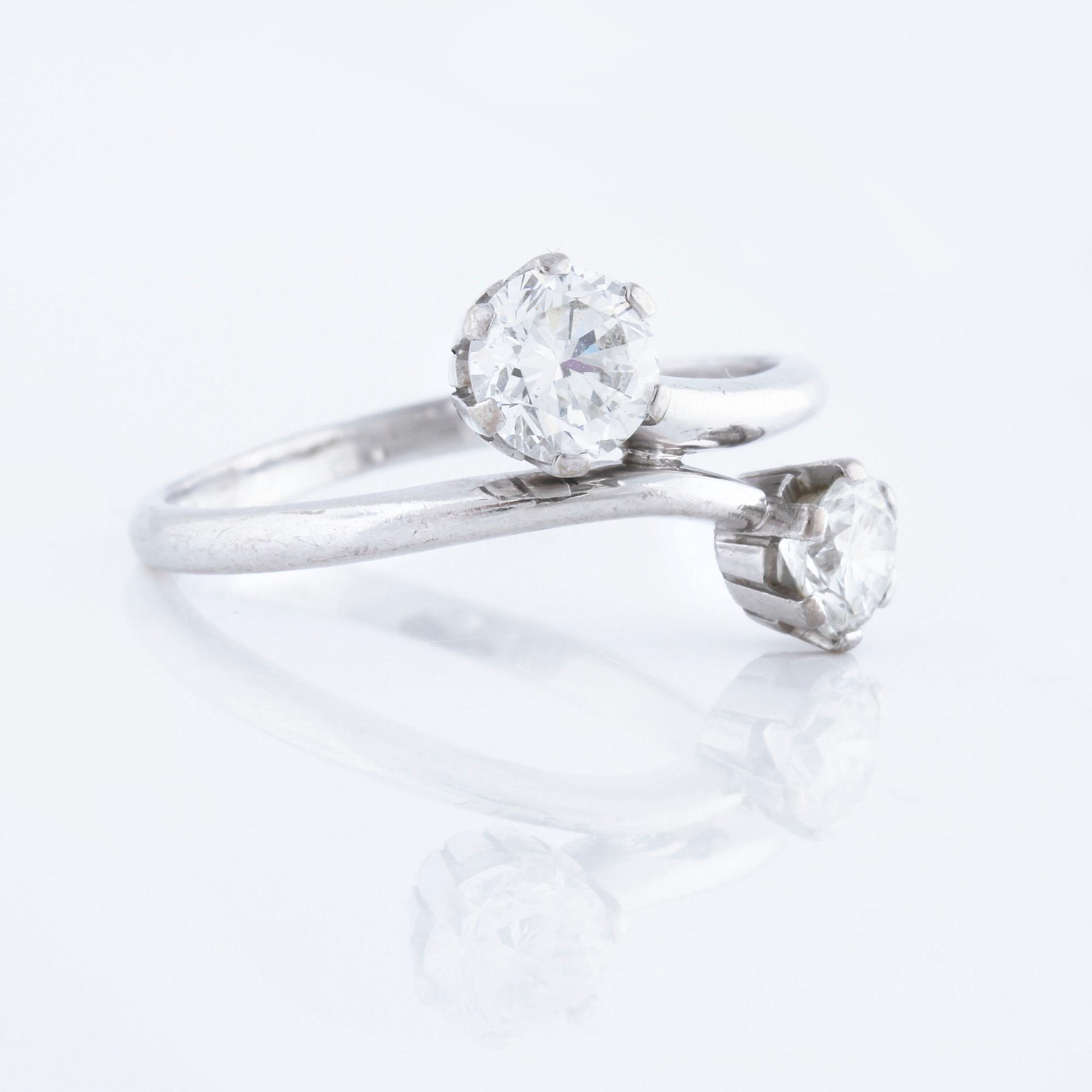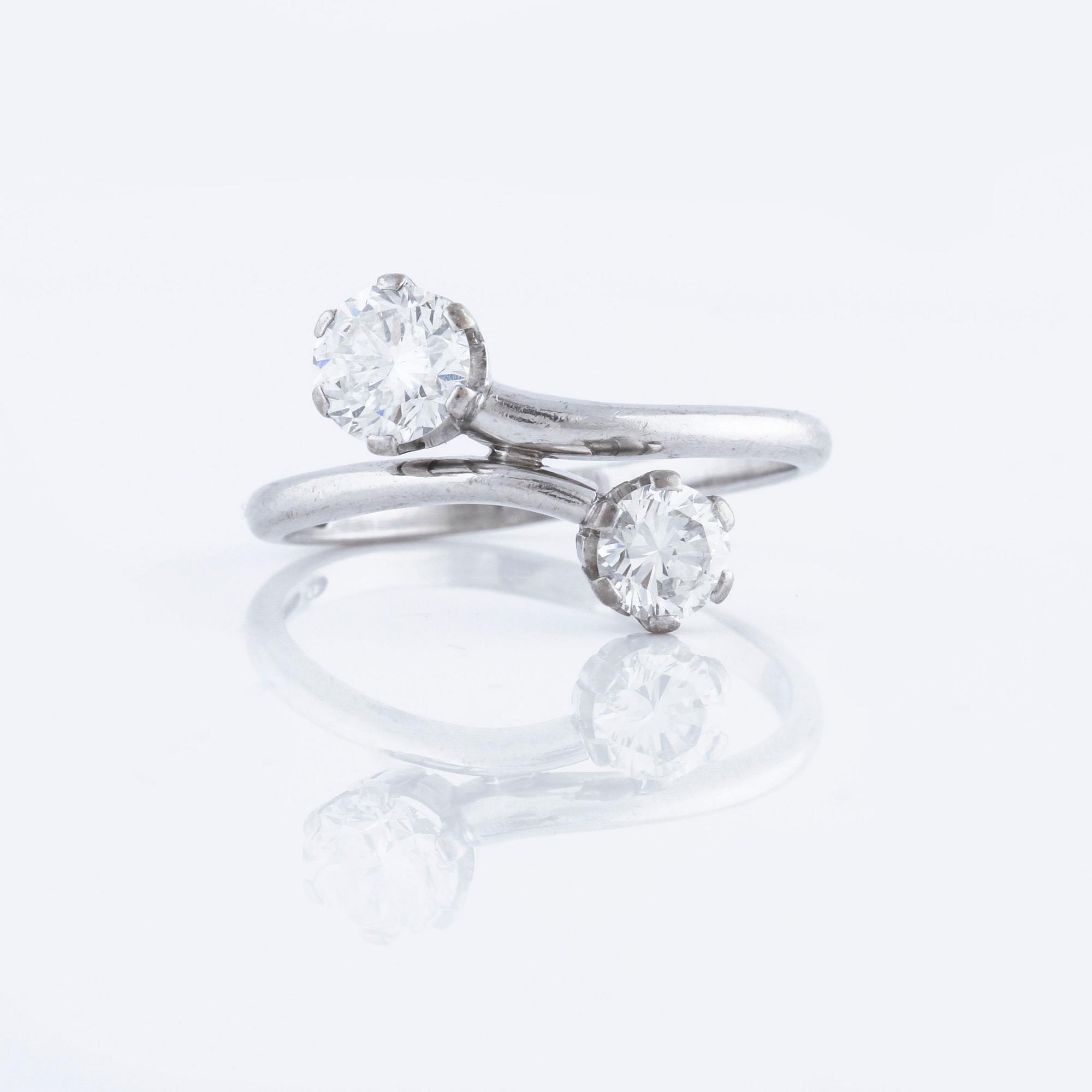 18K white gold. 0.77 cts diamond with carat and quality G/VS2 according to certifiacte from Westerback, Helsinki, 1982. 0.50 cts diamond with quality ca H/VS. Ring with size 18,25/58. Weight 3,7 gram.