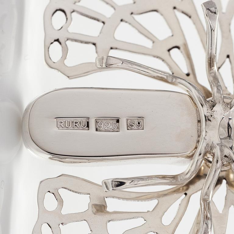 Throughout the years Runeberg’s works have evolved from being traditional silver corpuses to becoming more sculptural, humoristic pieces with their function hidden in an inventive way. Characteristics in his corpus objects are the combinations of silver and hand-blown glass, where the glass gives a dash of colour to the silver pieces. In his jewellery he often combines silver with different semi-precious gemstones or glass to give them a pop of colour, but also be a functional part of the object, such as a handle or vessel. Runeberg’s works are therefore not only functional but also humoristic with their small quirky details. All of Runeberg’ s contemporary corpus objects and jewellery are unique.