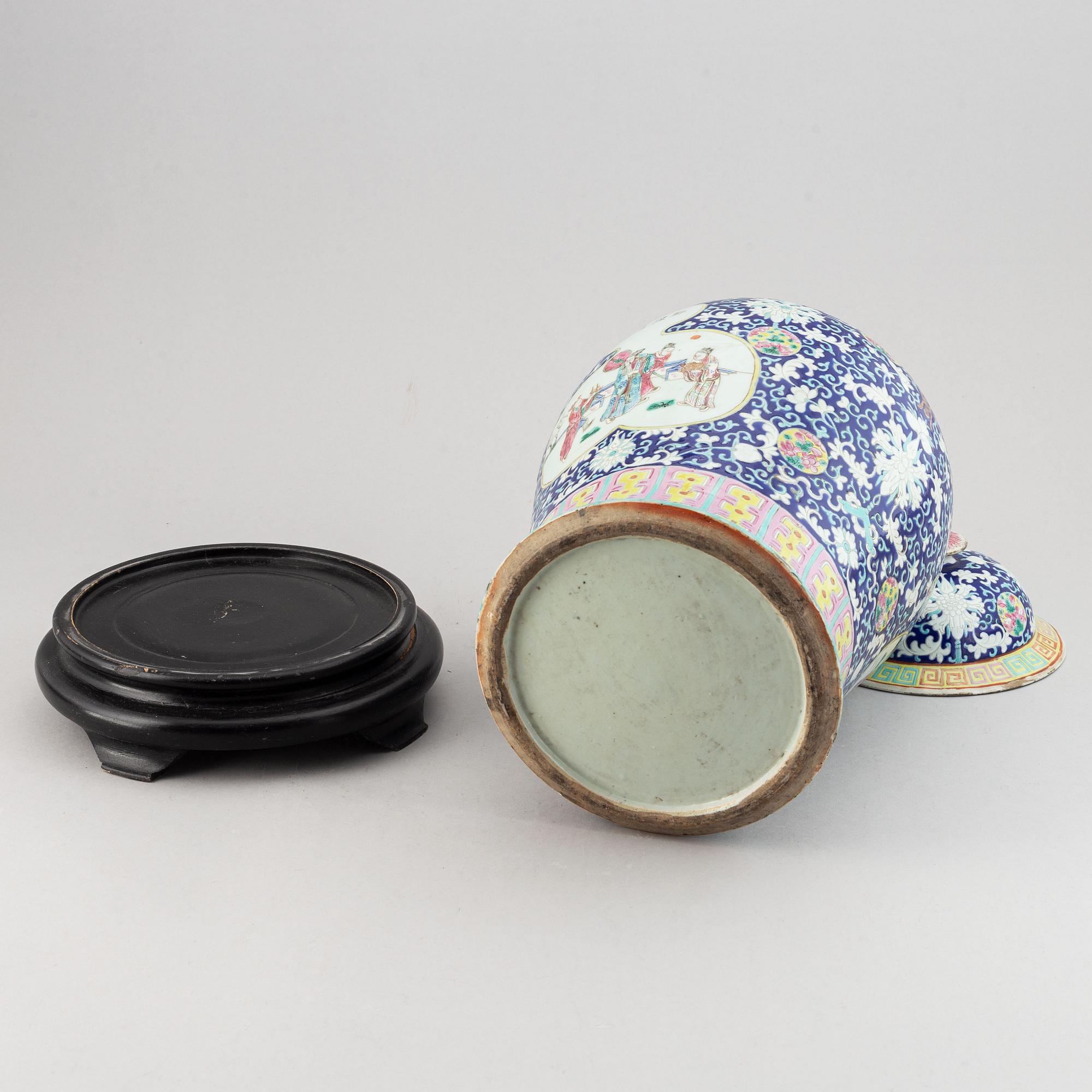 Baluster shape, decorated with figure scene and a continous lotus scroll against a dark blue ground. Height 43 cm.