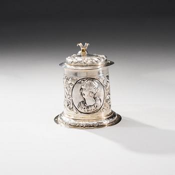 A German silver tankard made in Germany, Augsburg Late 17th century/early 18th century. Unidentified goldsmith AM (Rosenberg, nr 675). Repoussé chased with portraits of roman emperors. Height 14,5 cm. Weight 459 g.