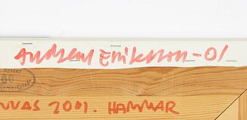 Signed Andreas Eriksson and dated 2001 on the reverse. Oil and acrylic on canvas 75 x 60 cm.