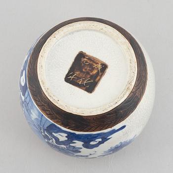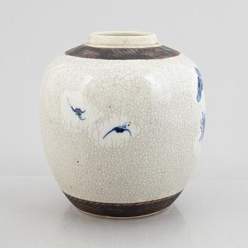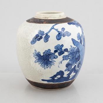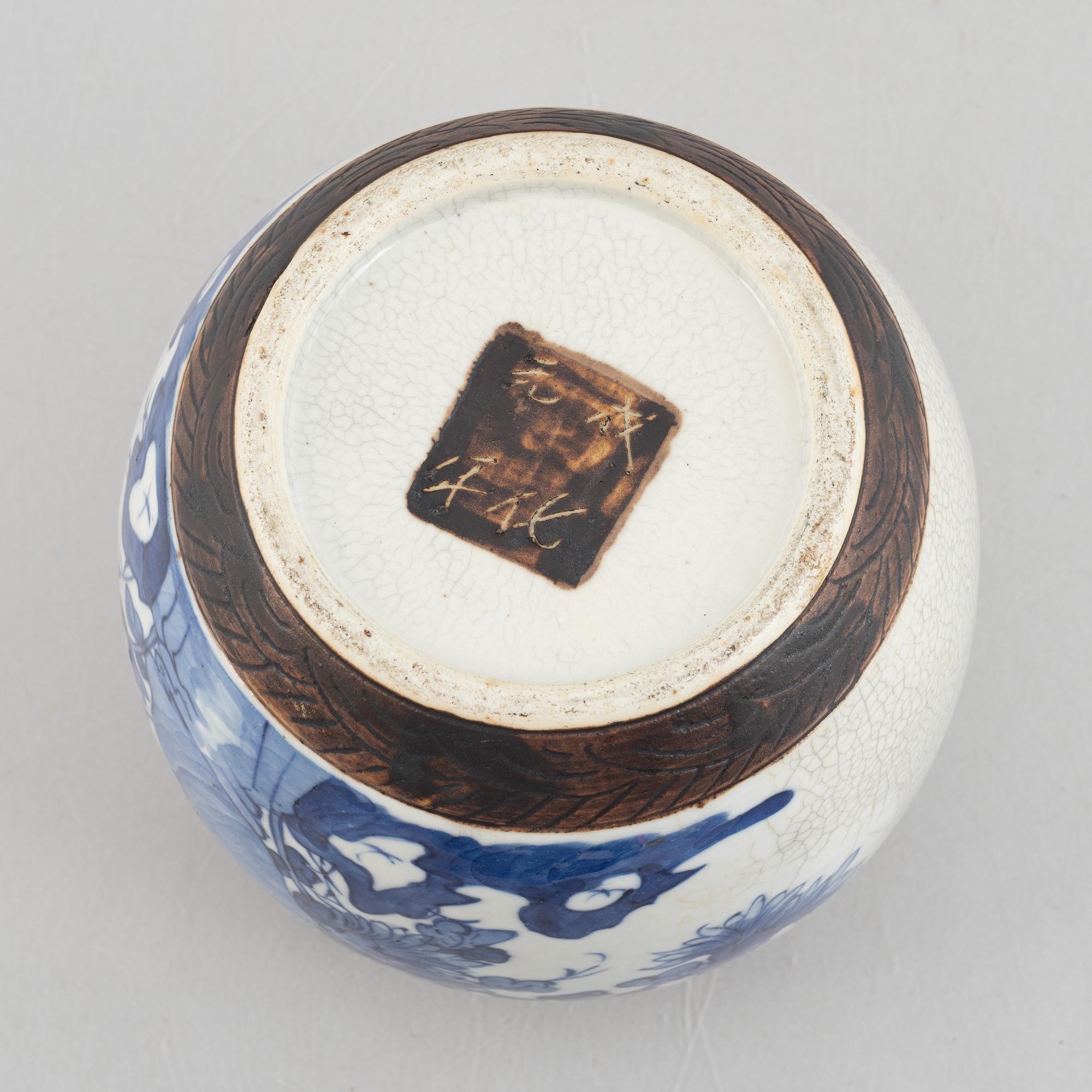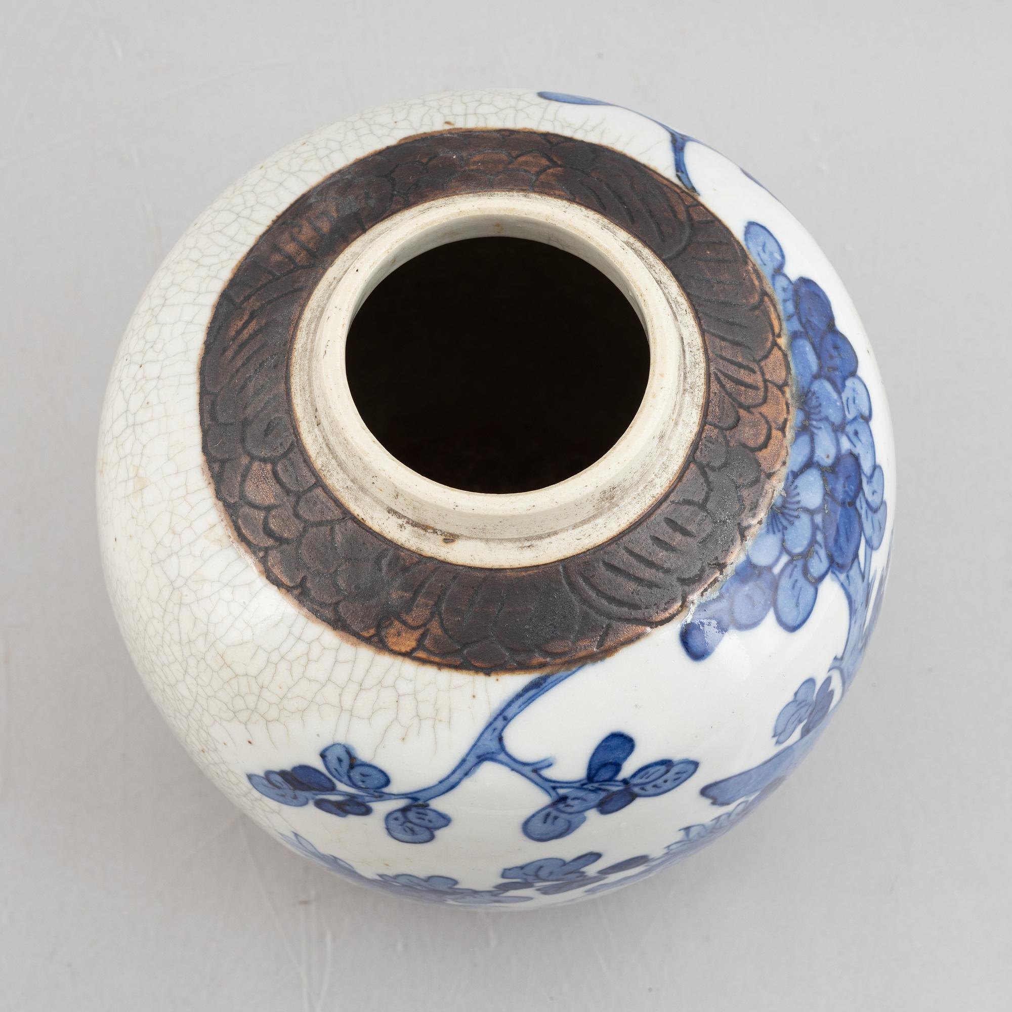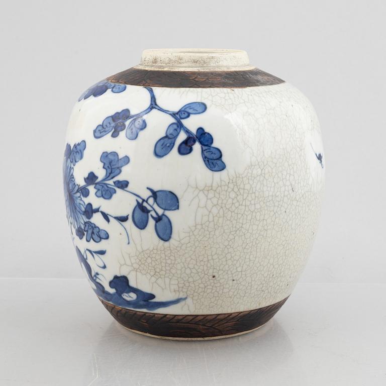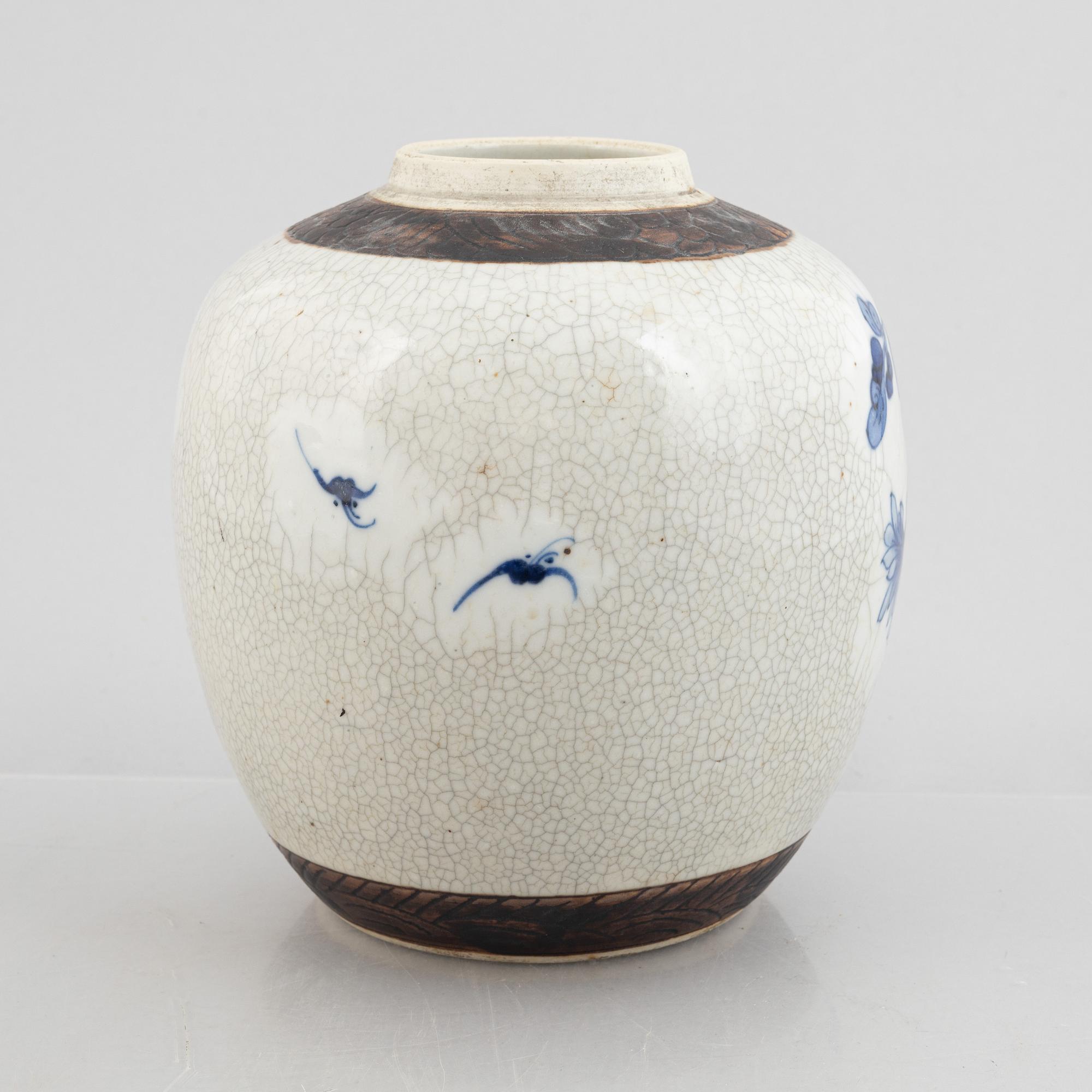 Decoration in underglaze blue of flowers against a beige, partially crackled background. Height 22 cm.