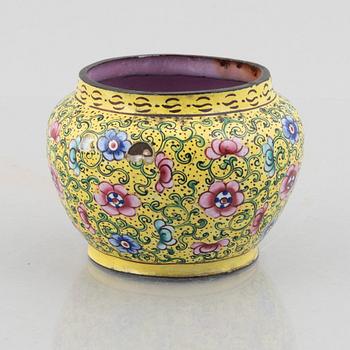Porcelain pot with famille rose figure scenes. Height 18 cm. Enamellled copper pot decorated with scrolling foliage and flowers against a yellow ground, pink interior. Height 6 cm.