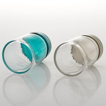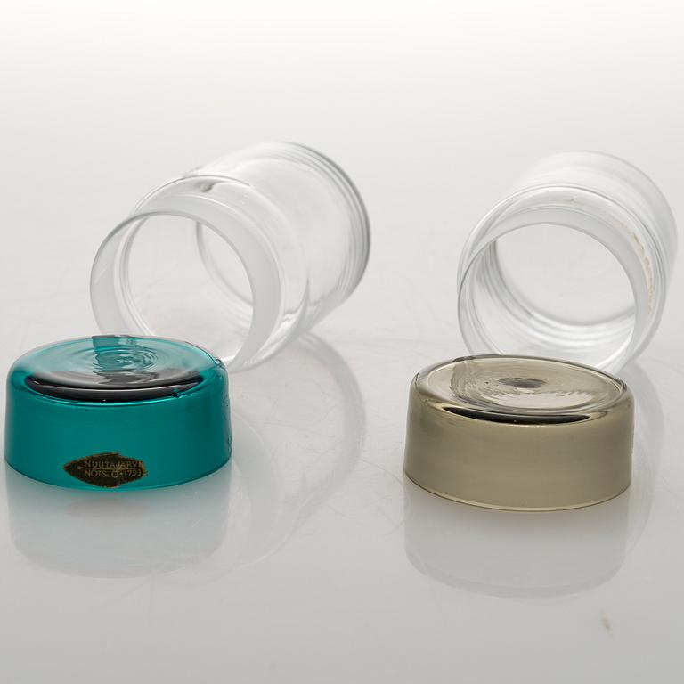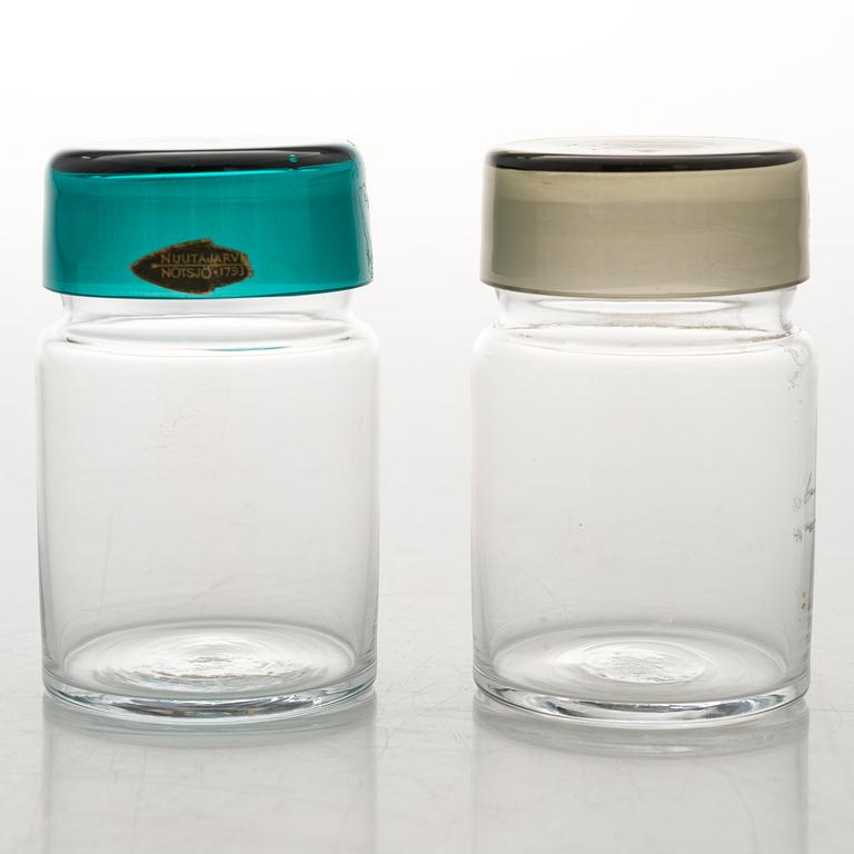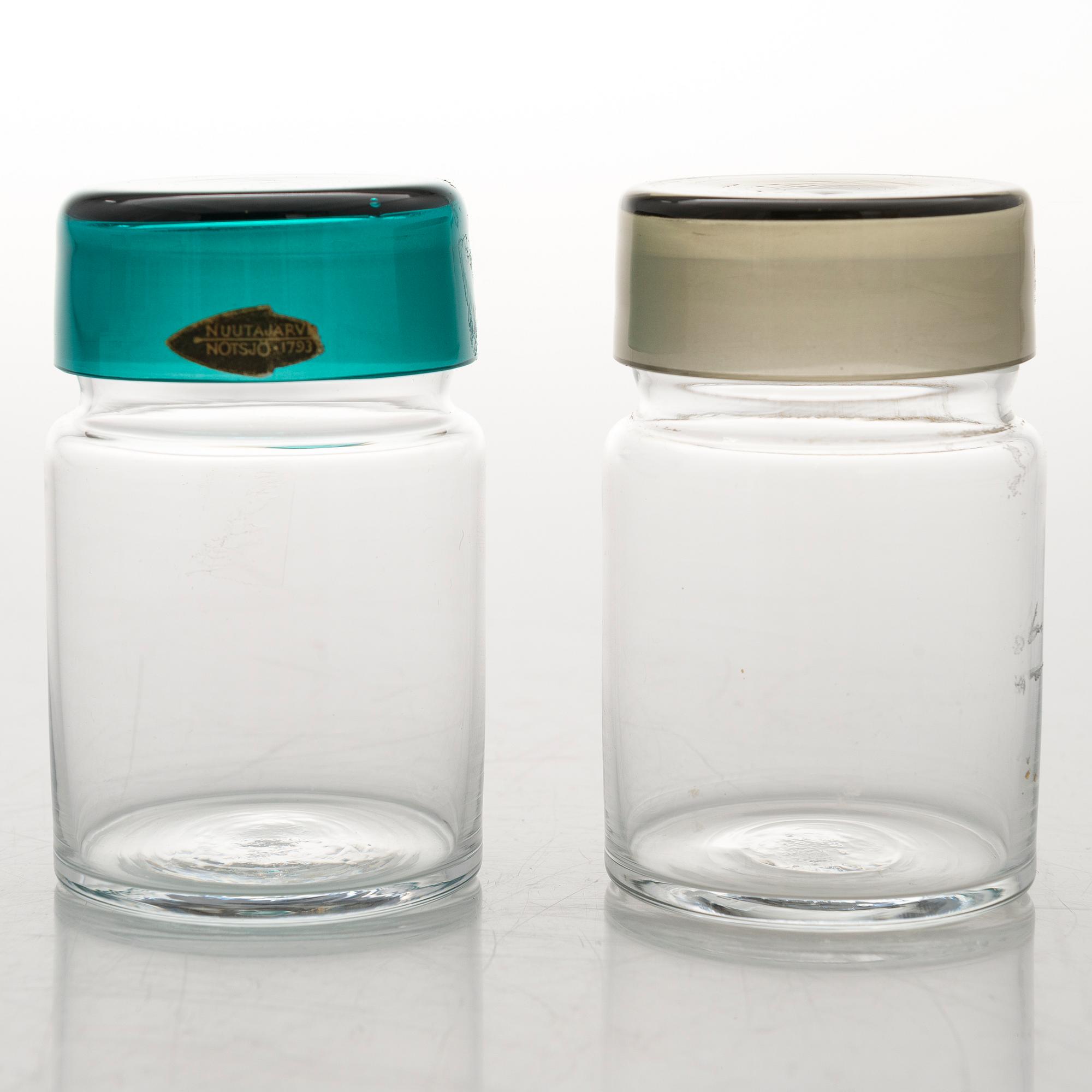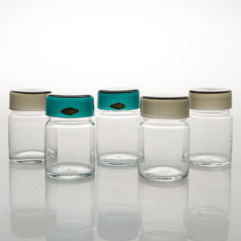 SAARA HOPEA, A set of five 1950s glass jars with covers by Nuutajärvi, Finland.