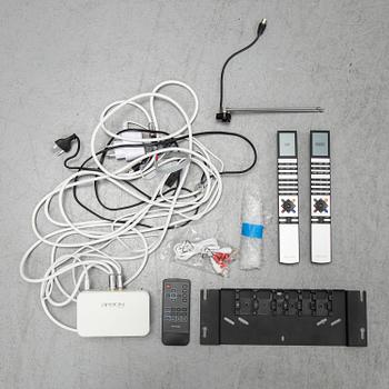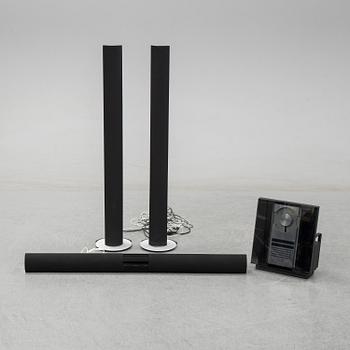 Två golvhögtalare, höjd 110 cm. En vägghögtalare, längd 112 cm. Två fjärrkontroller och manual. Sladdar medföljer.