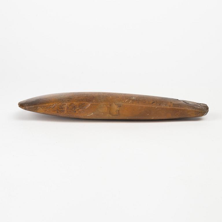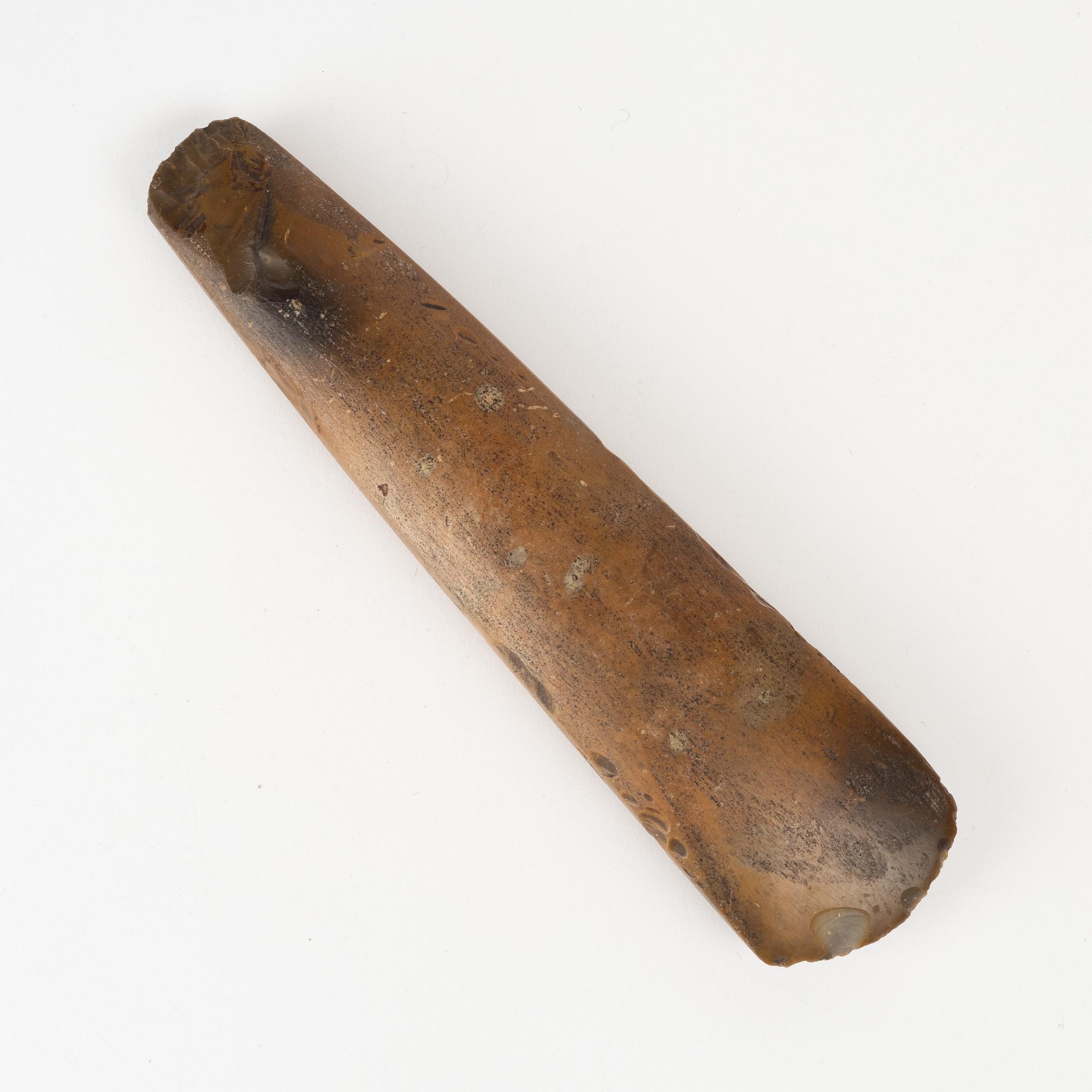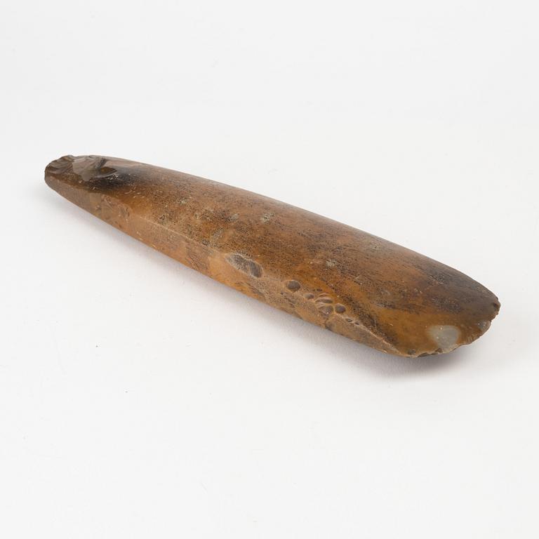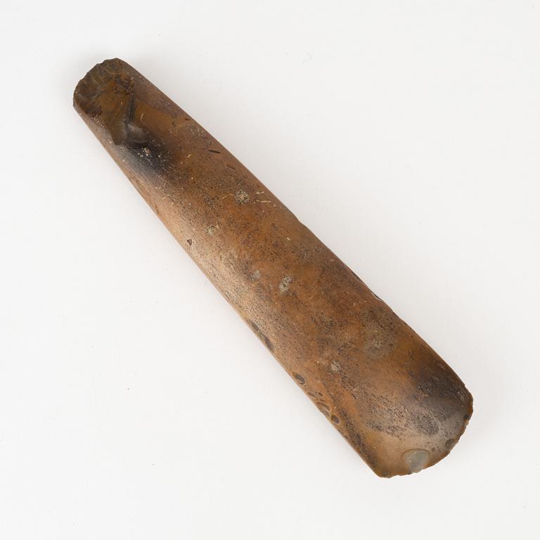 Tunnackig yxa av slipad rödbrun flinta. Längd 25,5 cm.