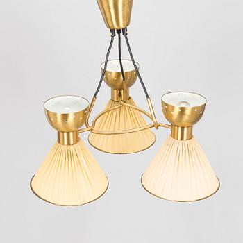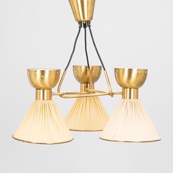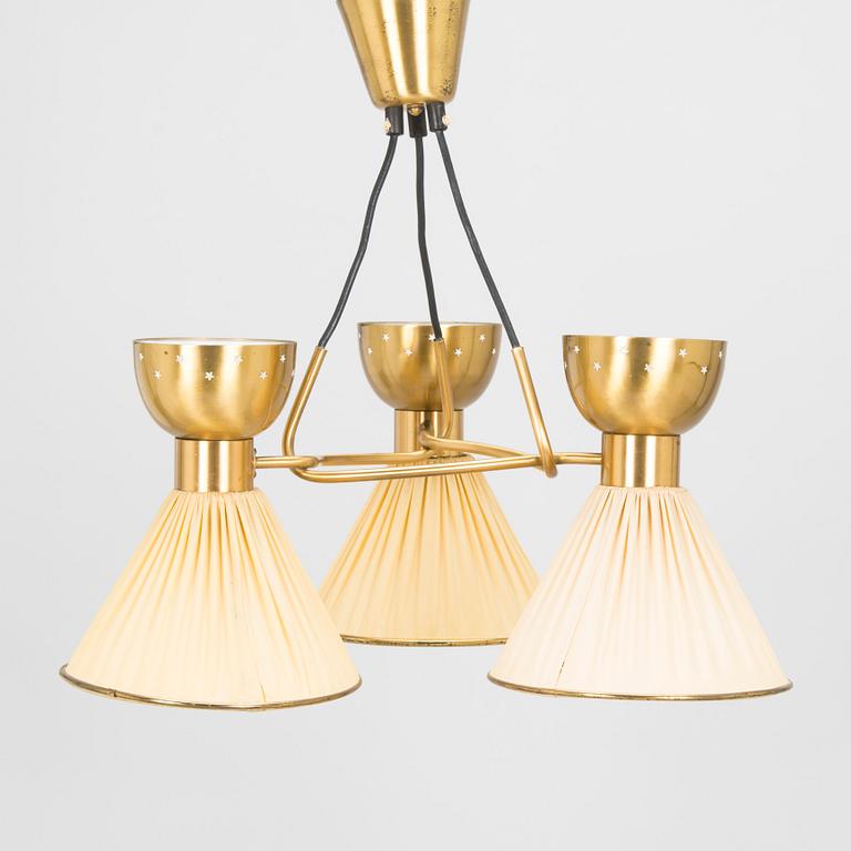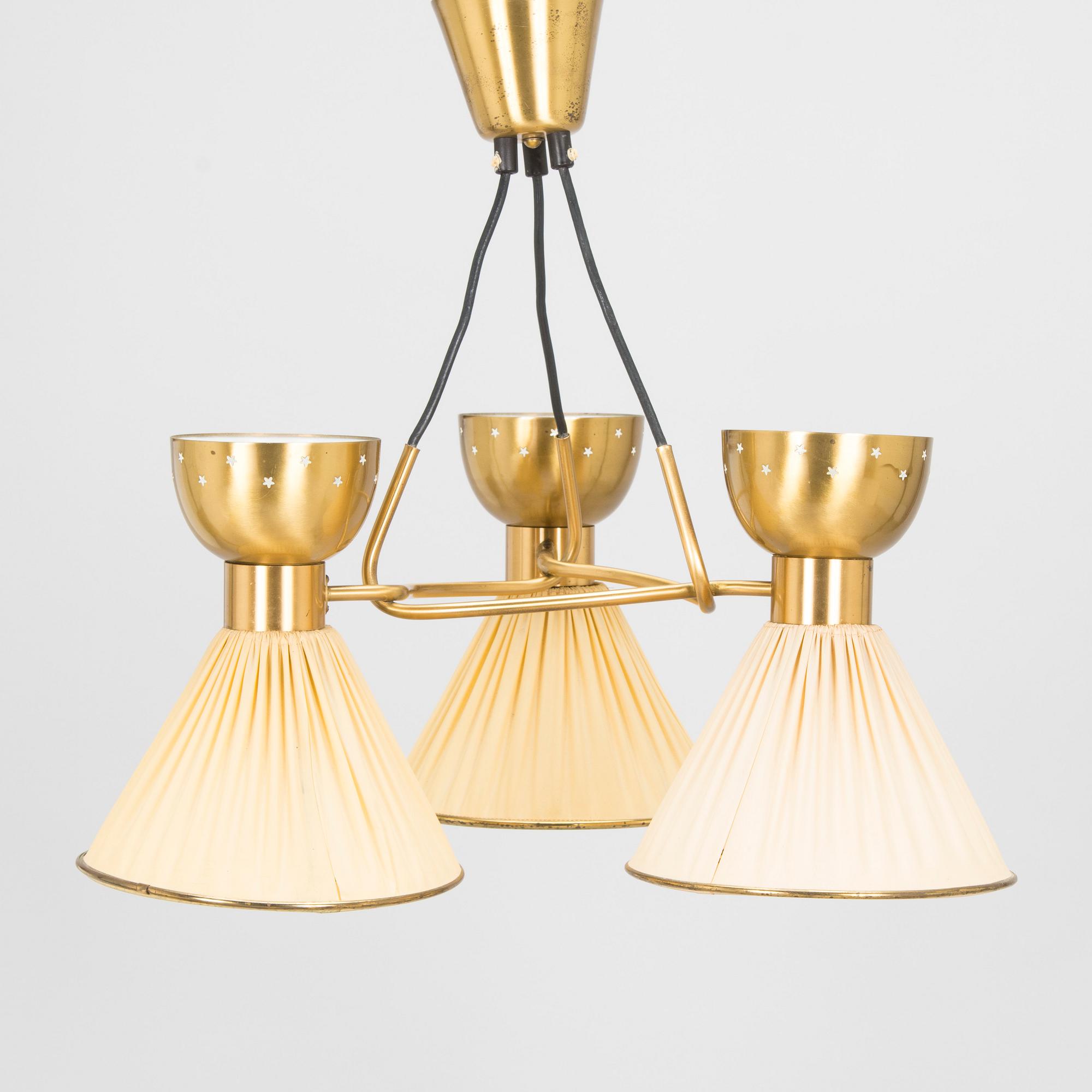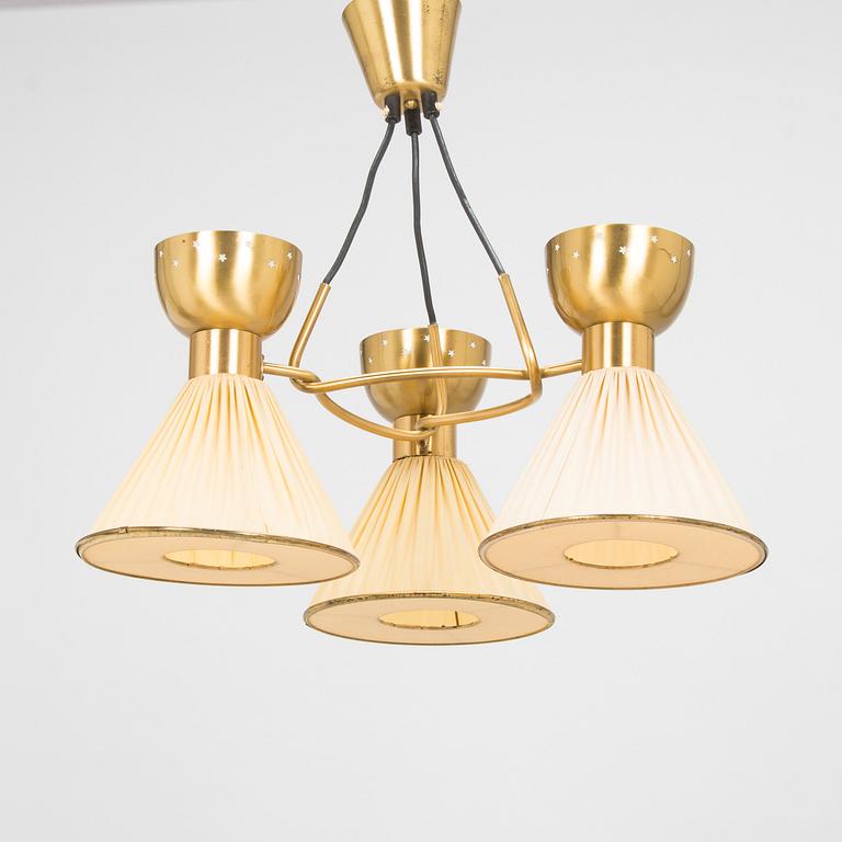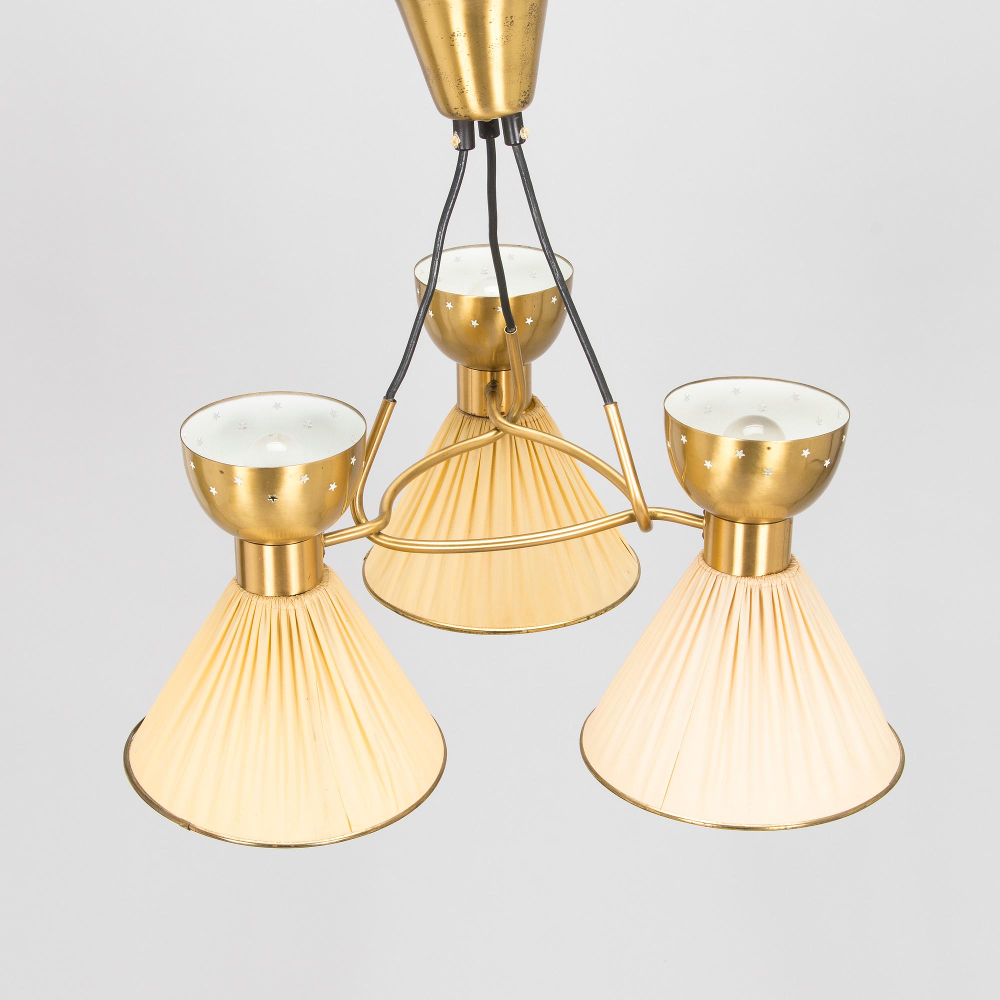 Brass frame with three textile shades. Star-patterned decoration. A total of six light points. Diameter 55 cm cm, height 52 cm.