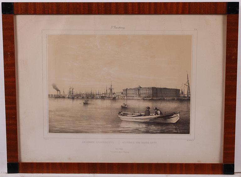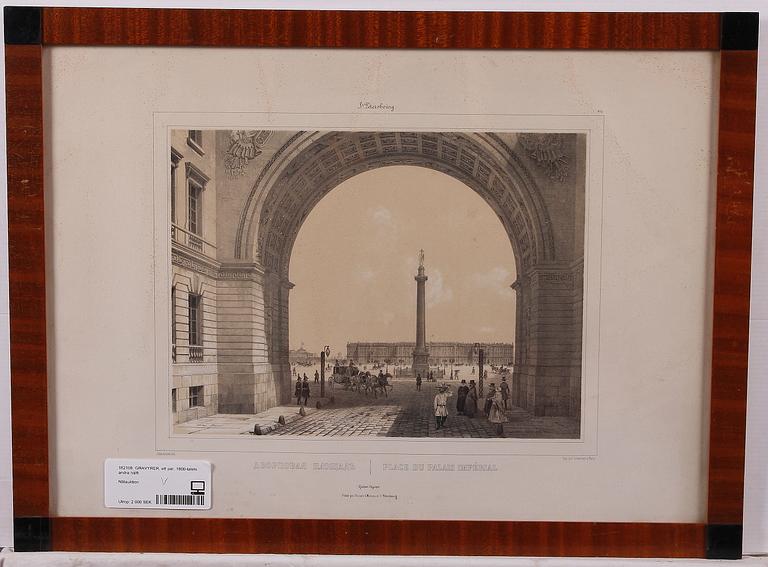 Vyer från S:t Petersburg: "Place du Palais Imperial" resp "Academie des Beaux Arts", bildstorl 37 x 26.