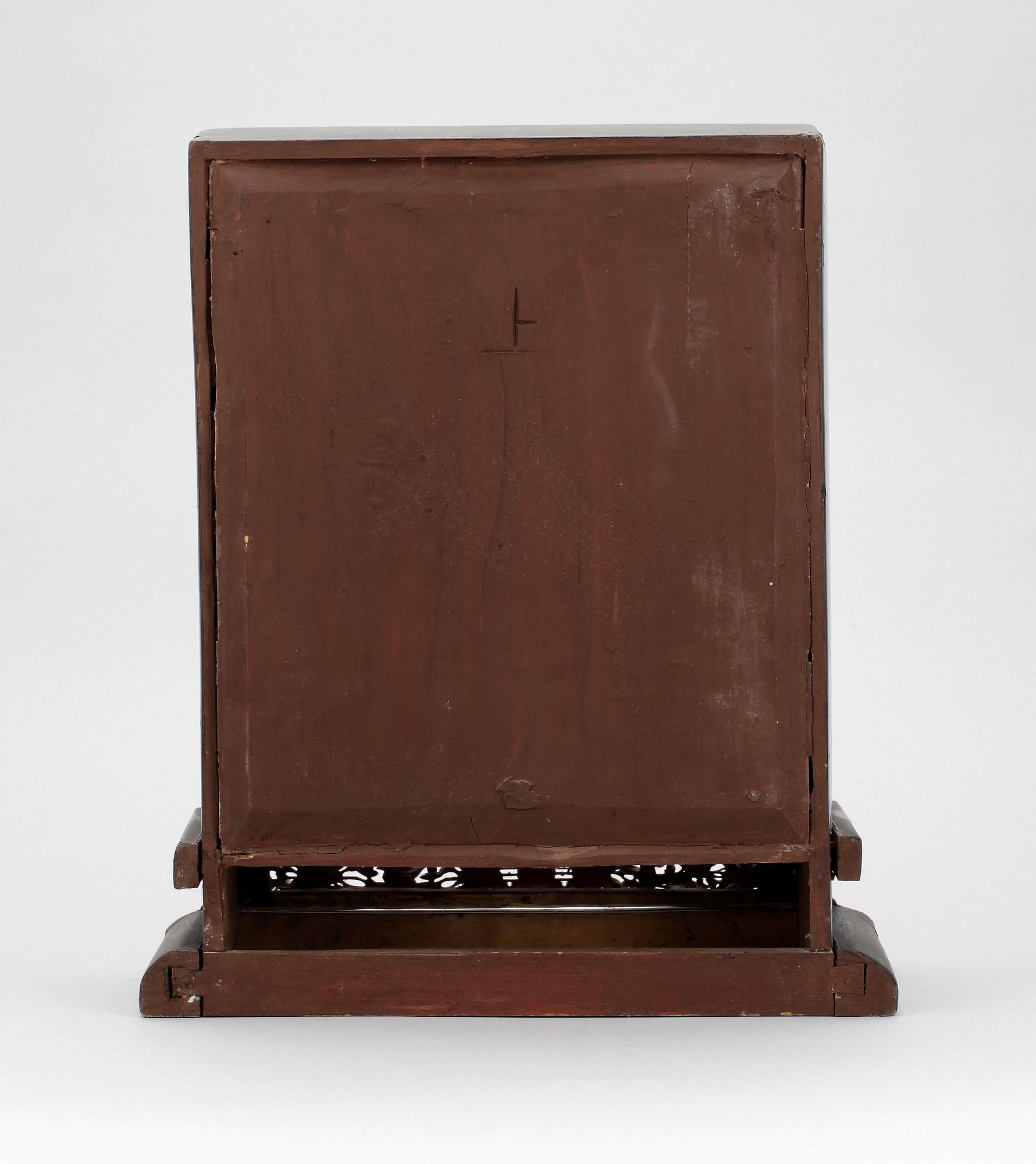Rak form, genombruten, förgylld dekor. Invändig landskapsmålning. L 34, b 14, h 43.