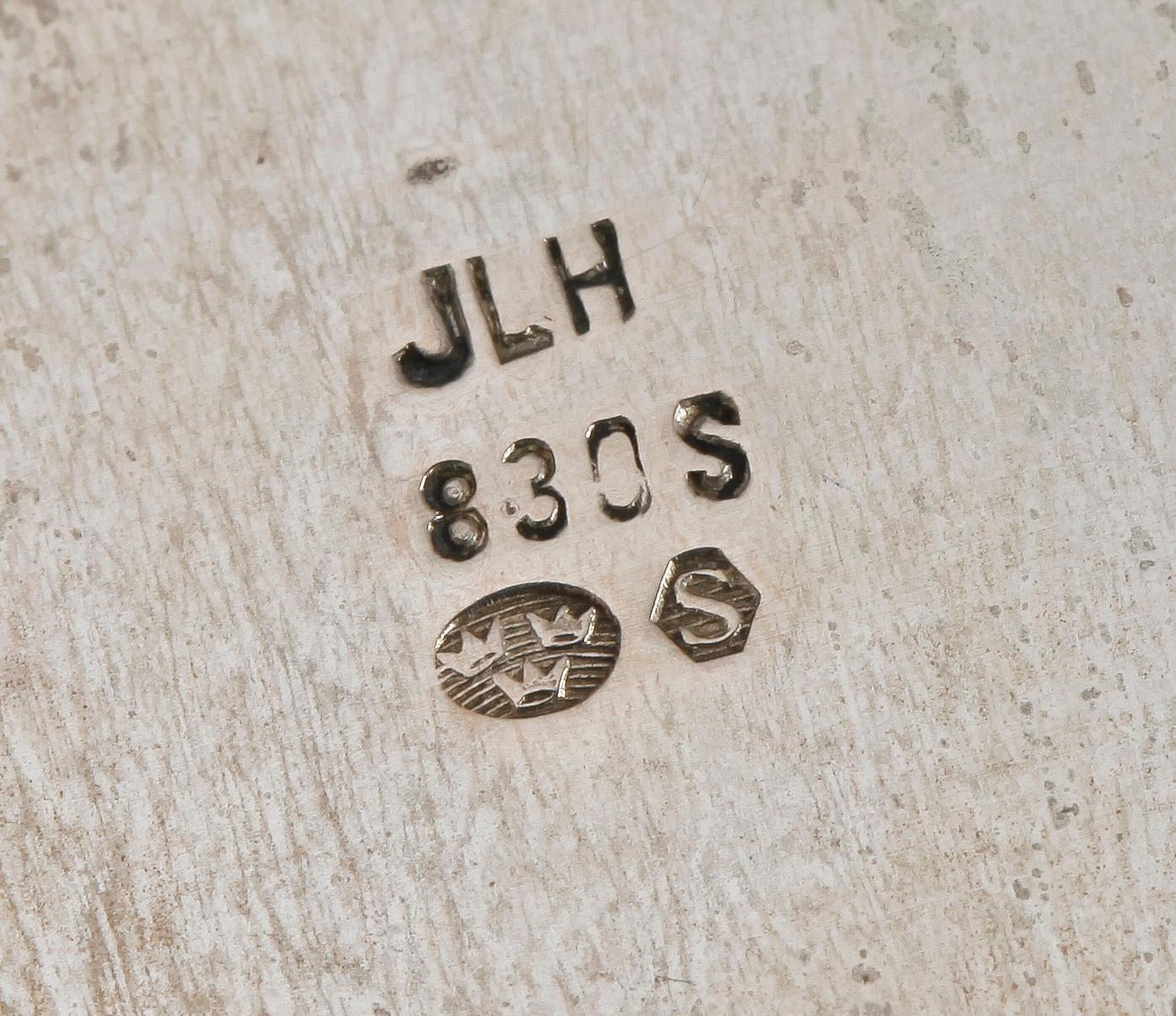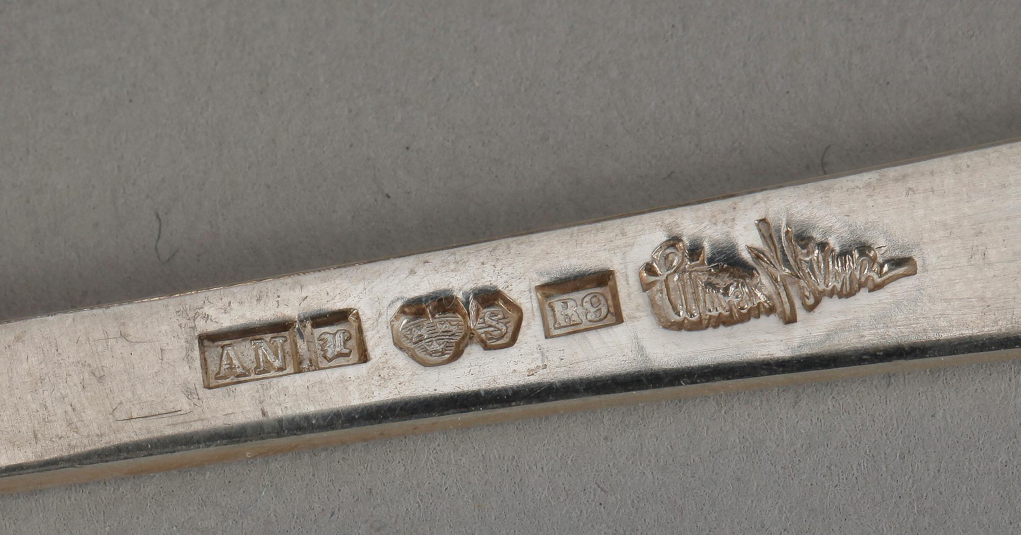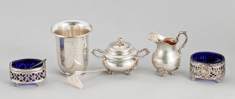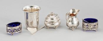Bägare, saltkar, ett par, skål med lock, gräddkanna samt påpetare. Två små skedar medföljer.