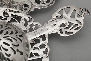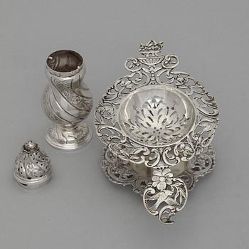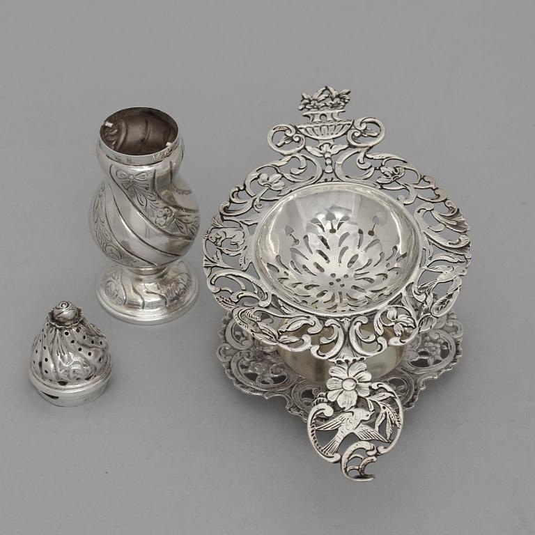 Tesil med genombruten dekor, l 16. I ställ stämplat GEWE, Malmö 1948. Saltströare, rokokostil, h 10.