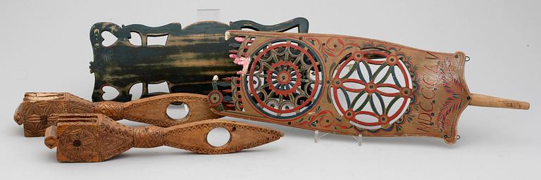 2 st vävlunor med snidad dekor av bl.a. hjärtan. H 33. 2 st rockhuvuden , målad dekor i gult, blått och rött. En med skuren dekor av Carl XIV Johans monogram. H 46-47.
