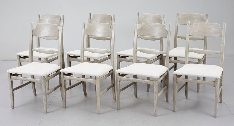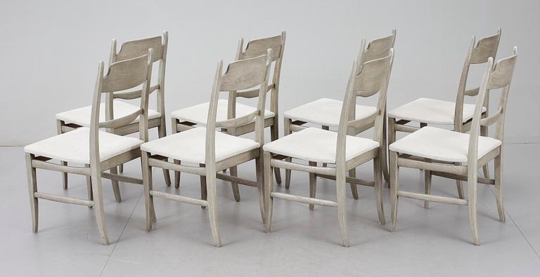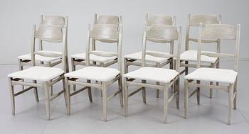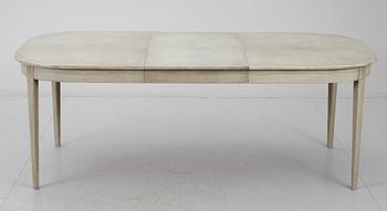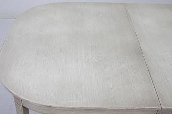 Matbord med iläggskiva samt 8 stolar. Stolarna stämpelmärkta. Senare grönmålat. L 150 (+ iläggskiva 55), b 100, h 74.